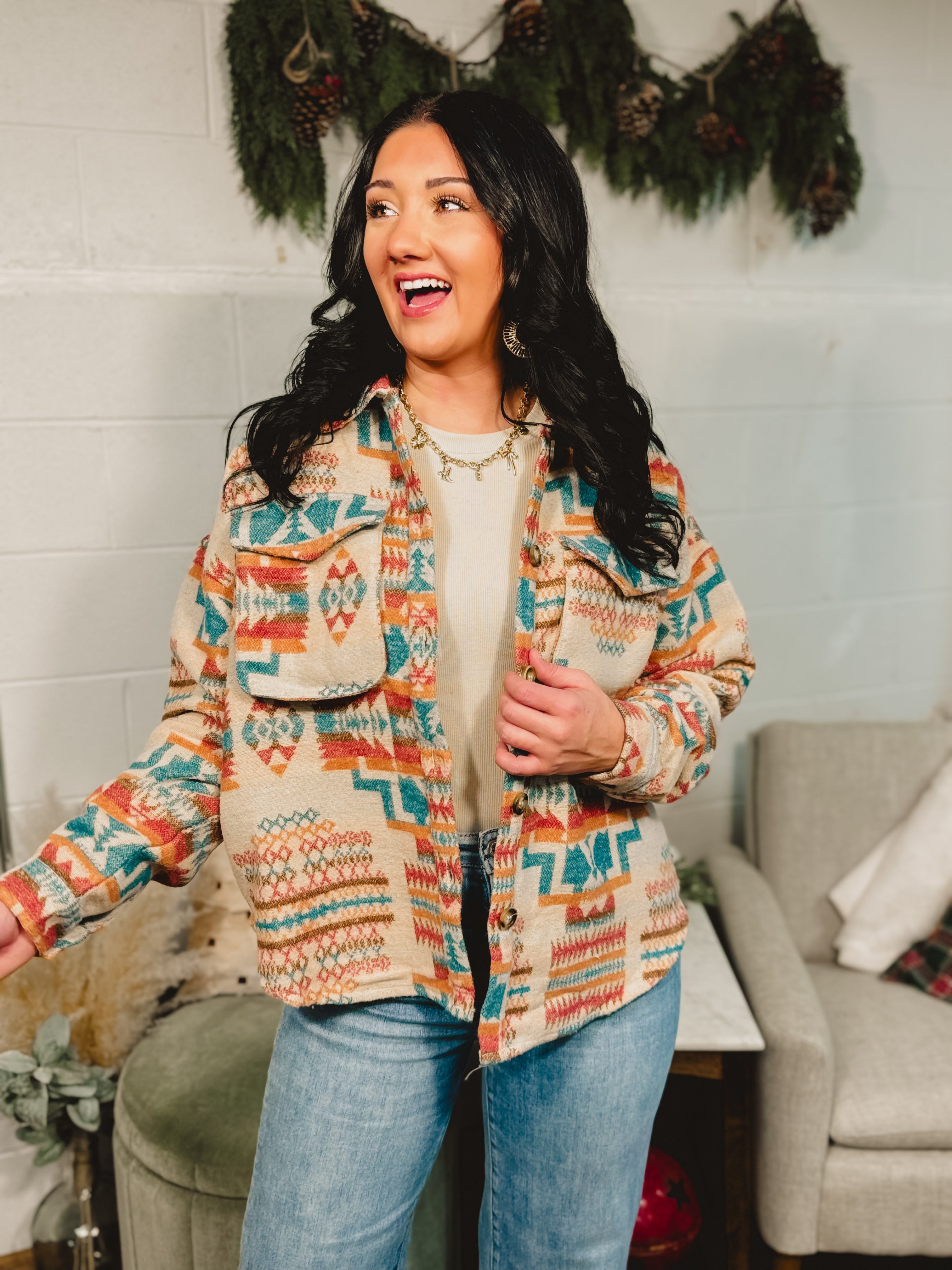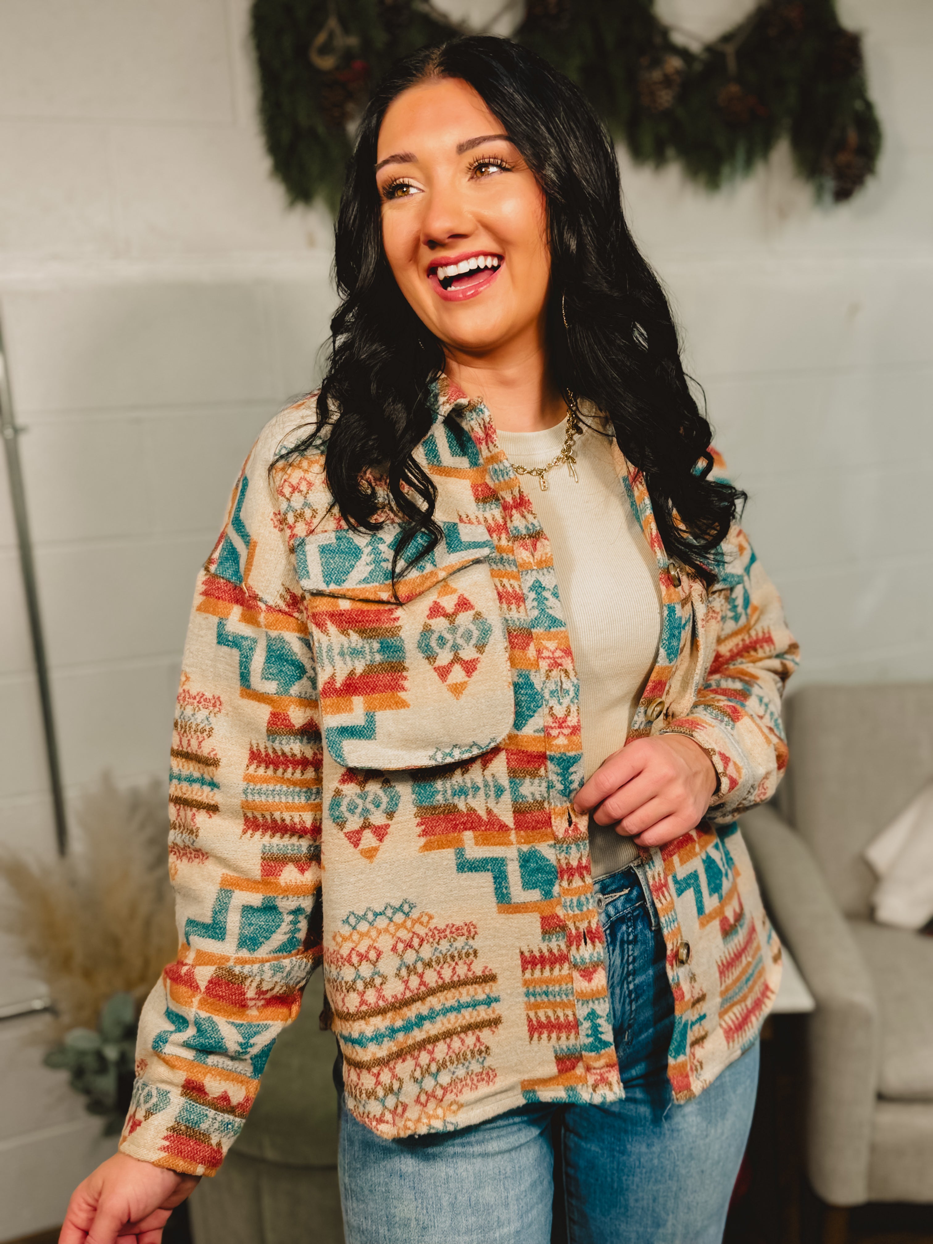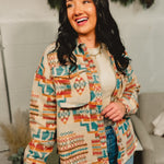 Cozy, bold, and perfectly on-trend—this Aztec printed button-up jacket brings the best of Western flair and everyday comfort. With its soft tones and relaxed fit, it’s the ideal statement layer for cooler days.
