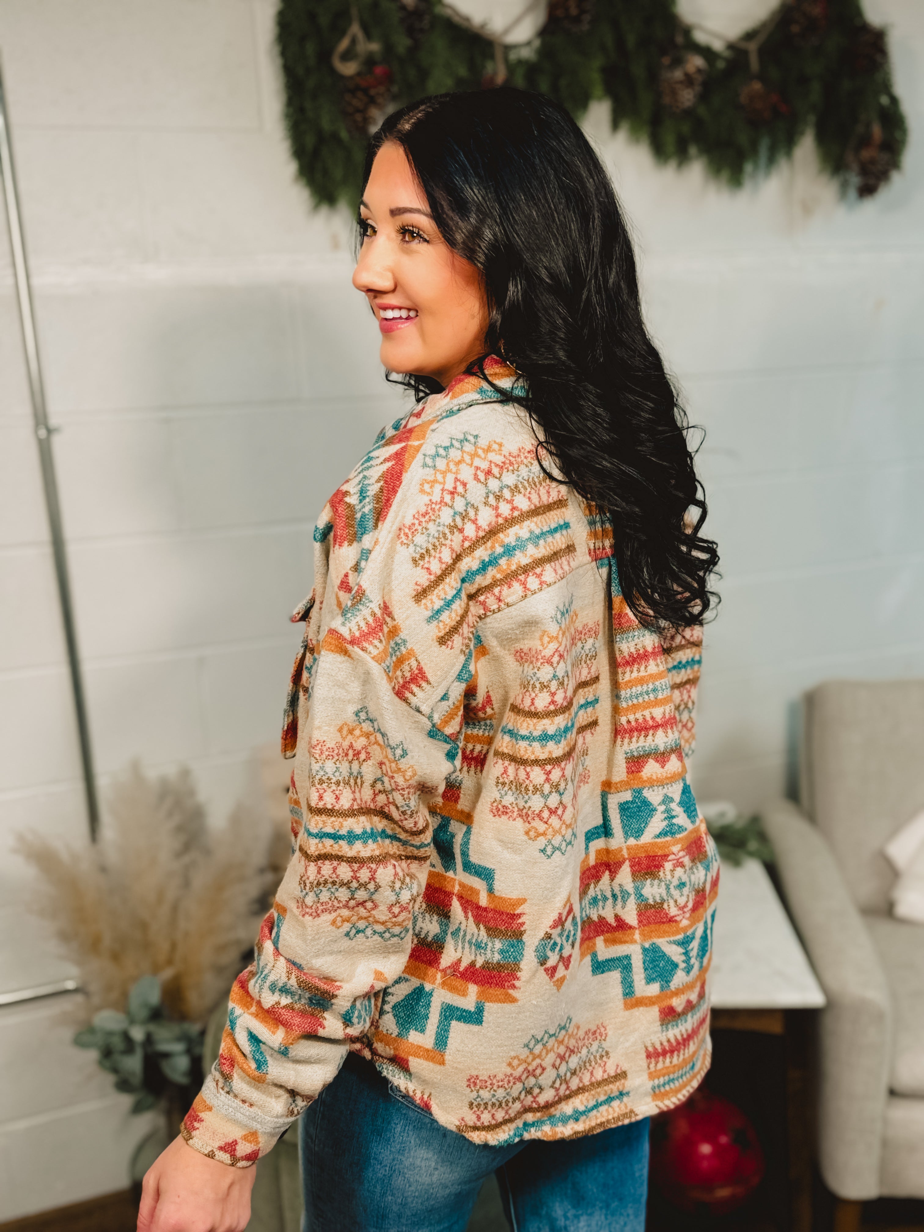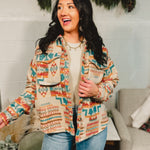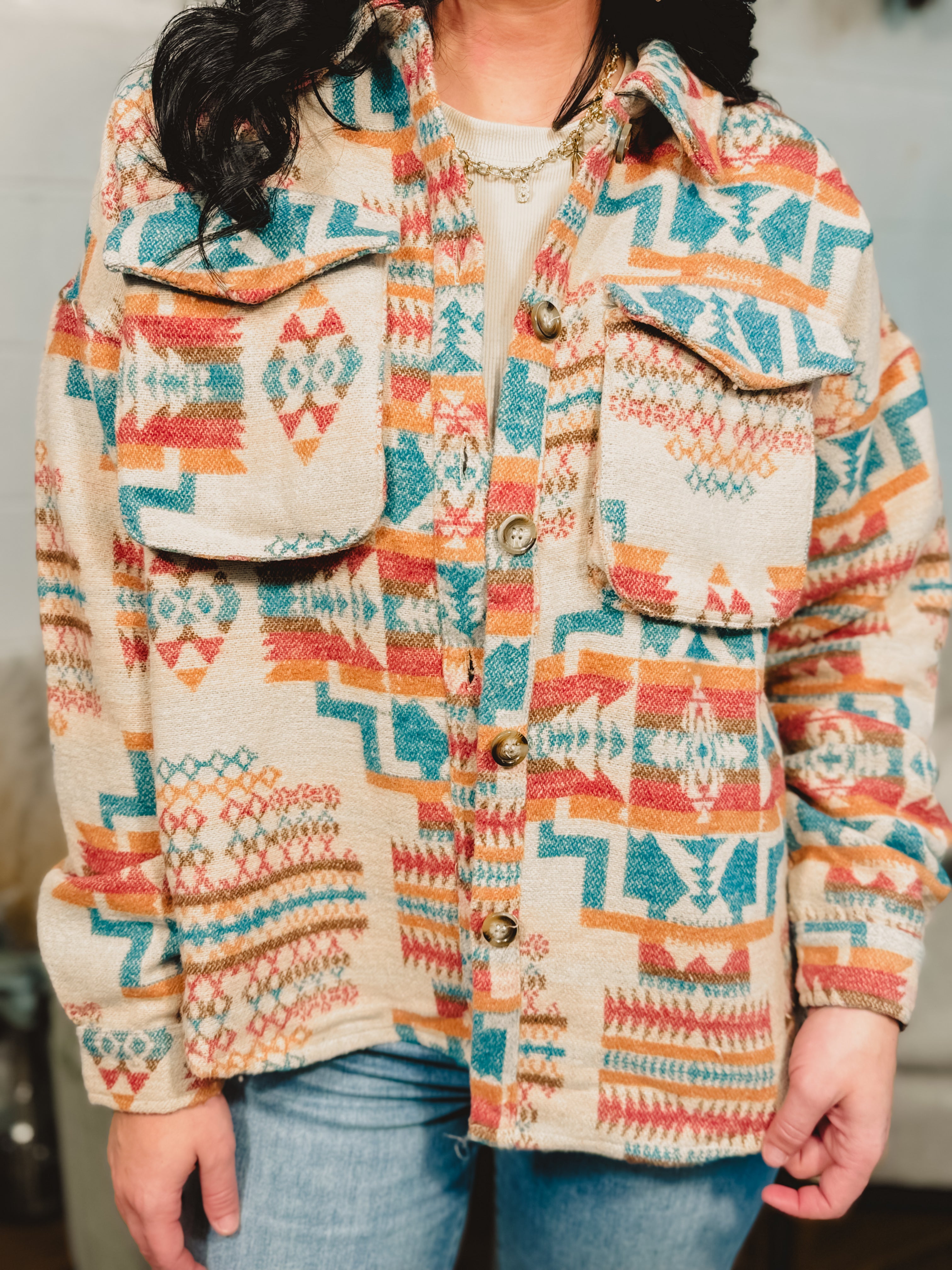 Aztec Printed Button-Up Jacket - Teal/Taupe