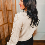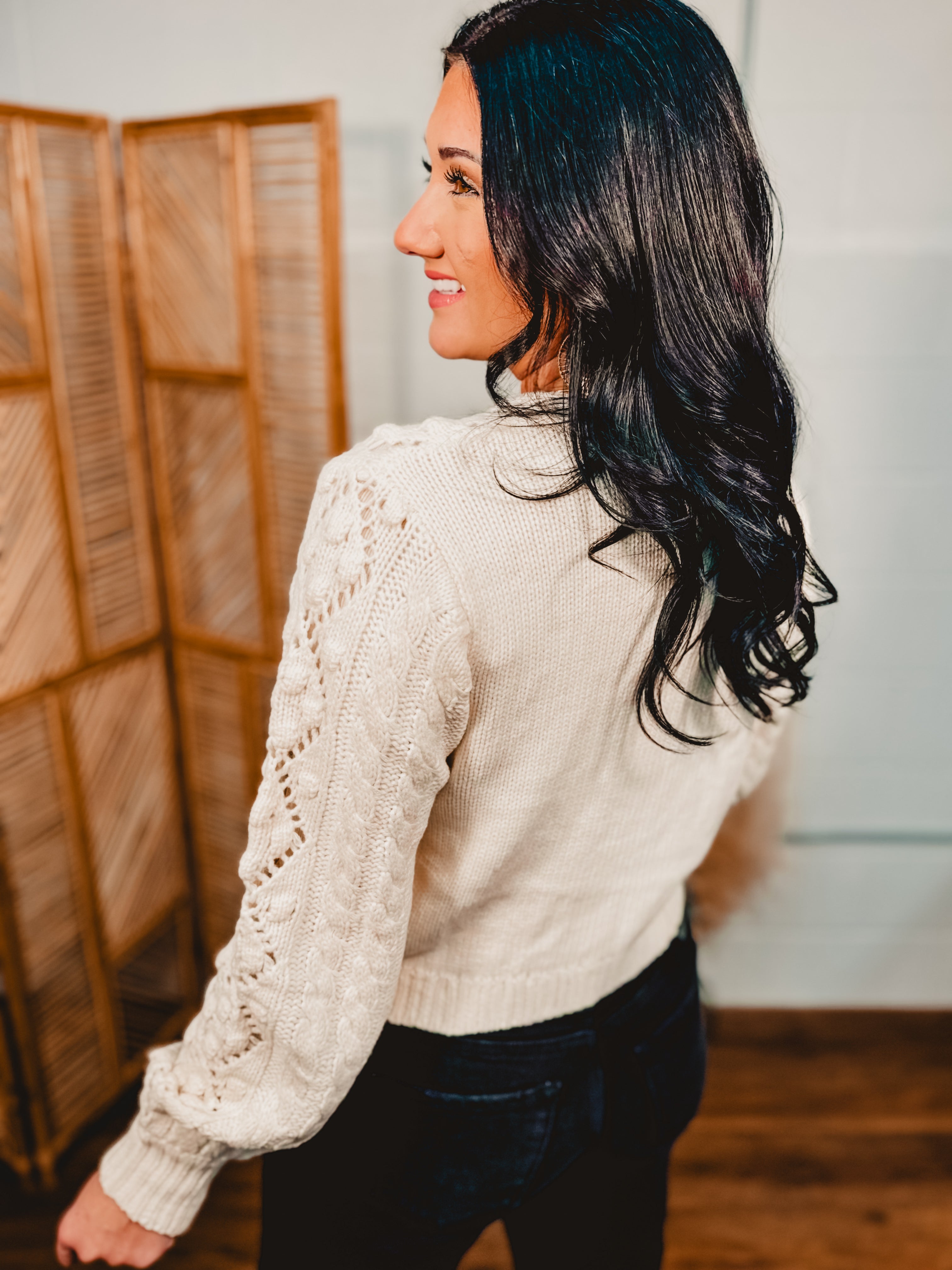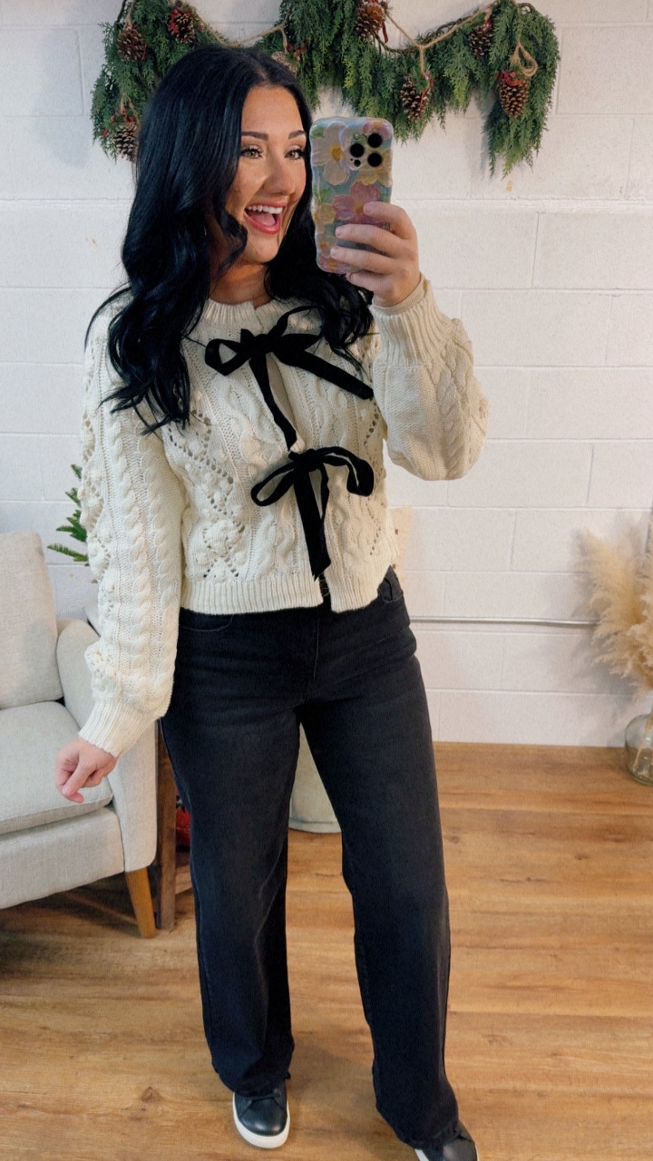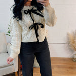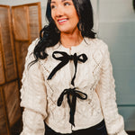 Sweet and sophisticated, this cream knit cardigan features delicate open-knit detailing and feminine black velvet bow ties down the front. With its soft texture and classic silhouette, it’s the perfect blend of cozy and chic for every season.