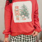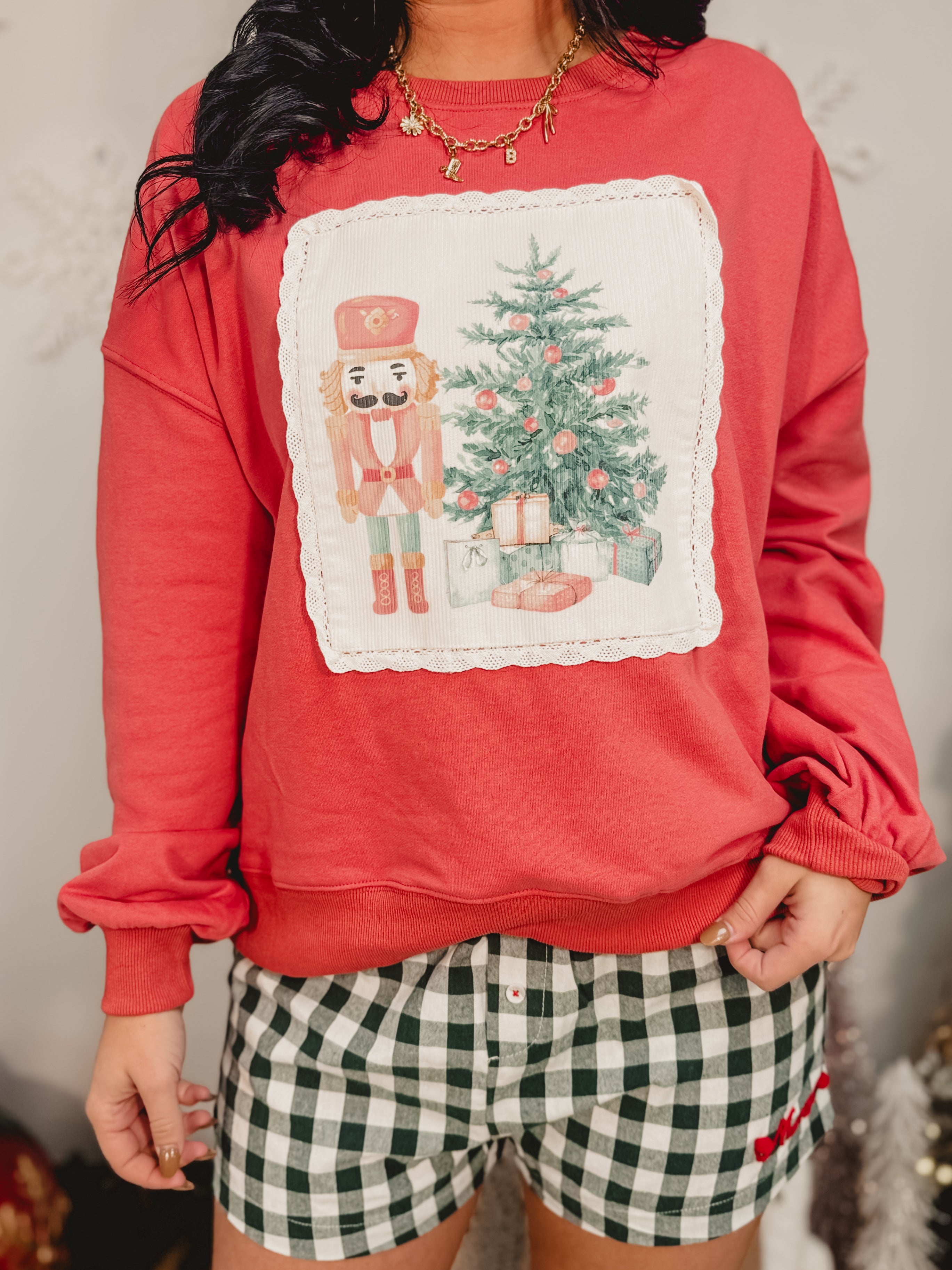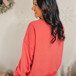 Uniquely festive, this dark coral sweatshirt features charming corduroy Christmas patches and delicate lace accents, blending cozy holiday vibes with a sweet feminine touch.