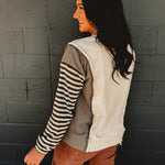 This striped sleeve top features a casual design with a relaxed fit, making it an easy go-to for everyday style and all-day comfort.