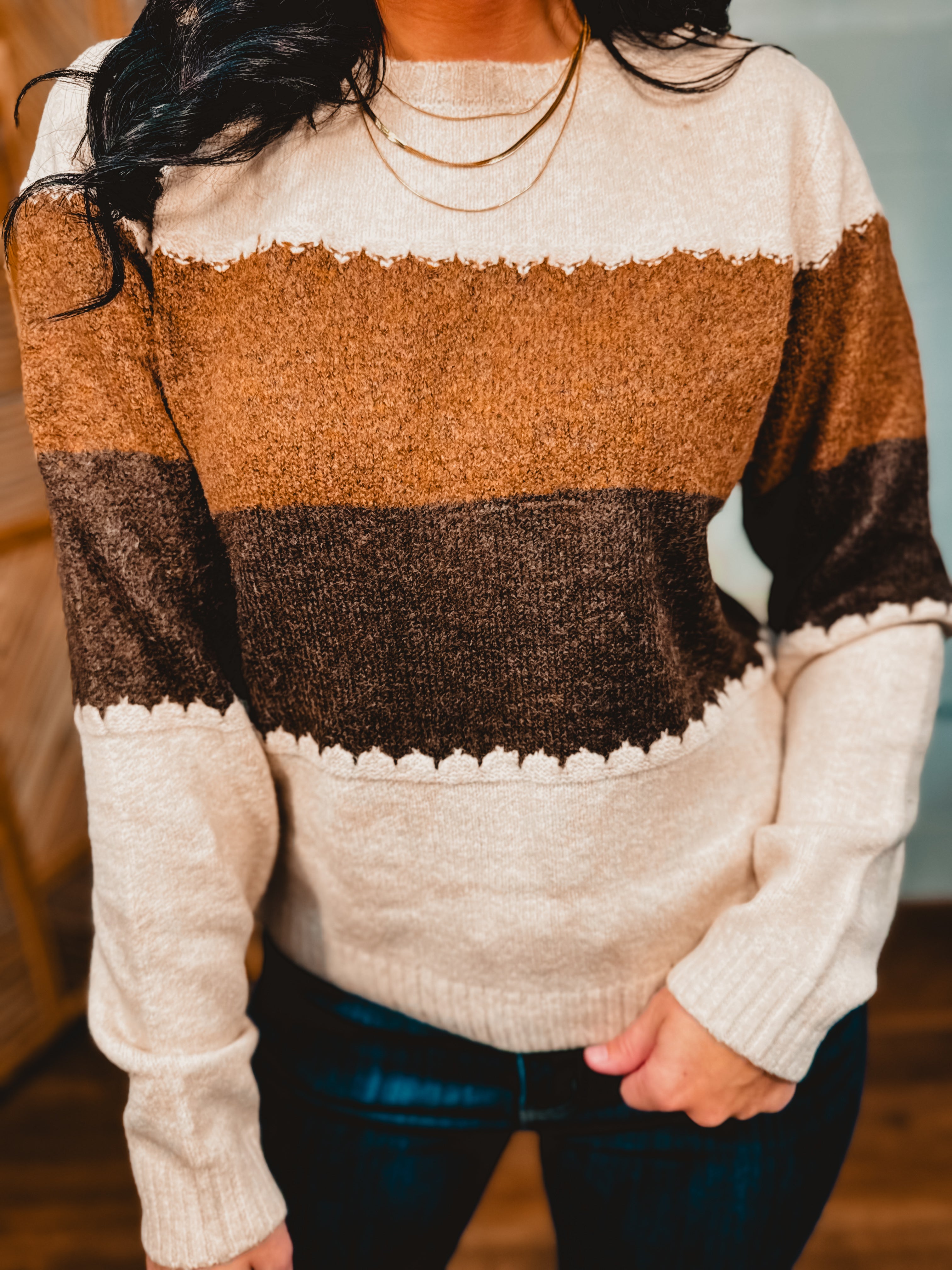 Cozy meets classic in this color-block pullover. Featuring scalloped trim between bold stripes and a wood-button shoulder detail, it brings a soft, feminine twist to timeless knitwear. Finished with ribbed edges and a relaxed fit for effortless everyday style.