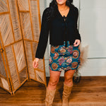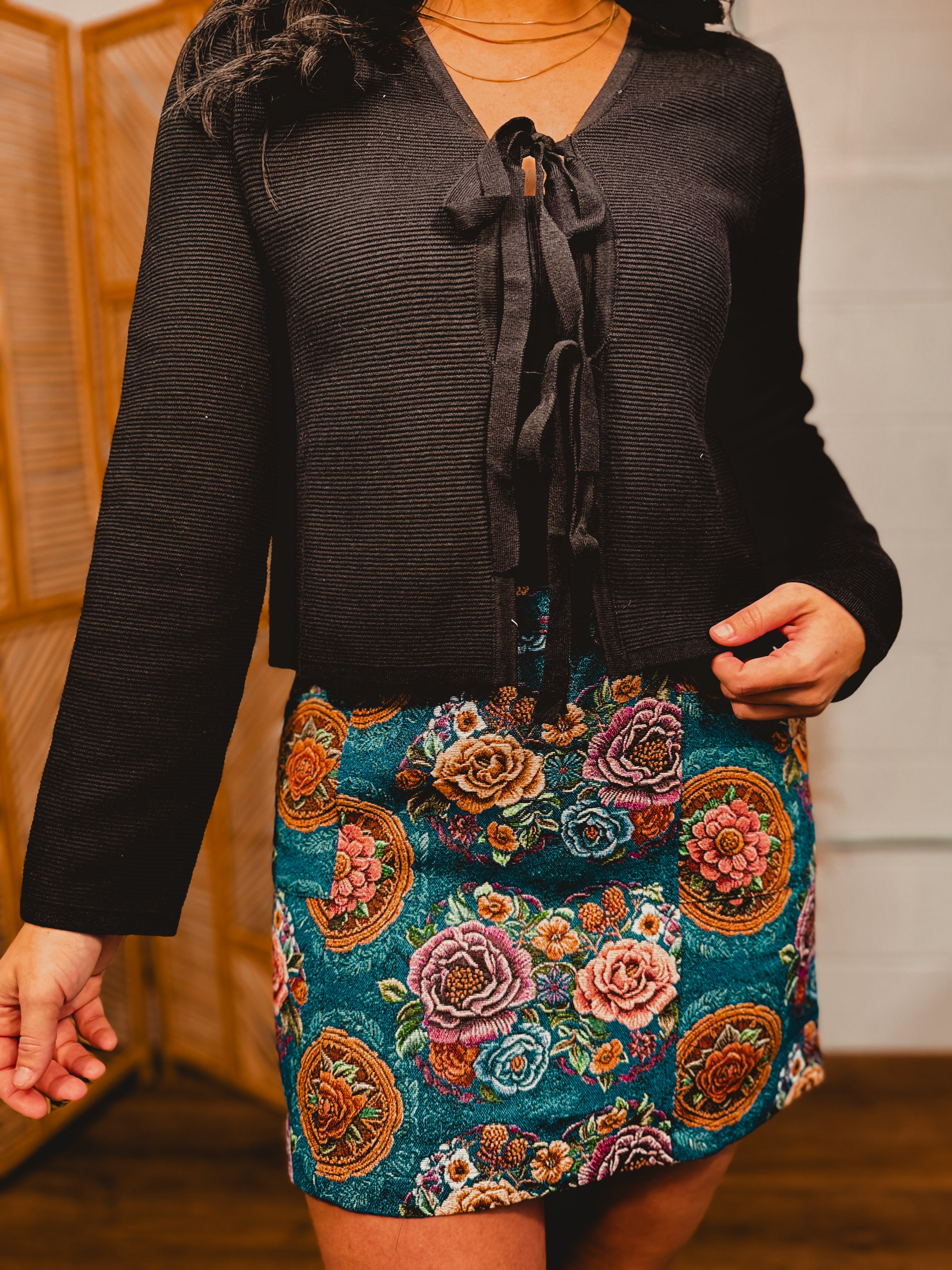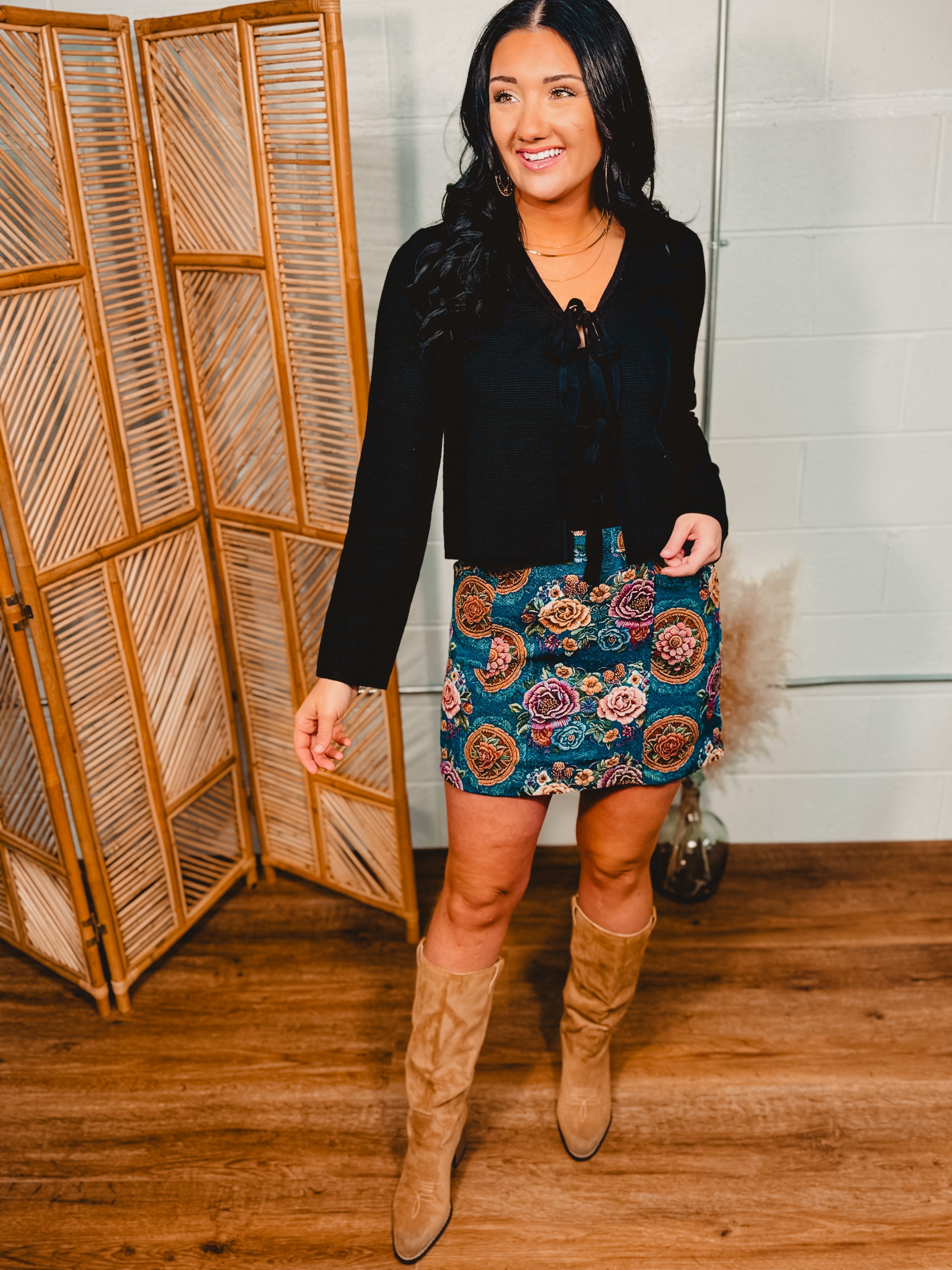 Rich and romantic, this teal blue mini skirt features a floral jacquard tapestry design, adding a touch of vintage-inspired elegance to your fall and winter wardrobe!