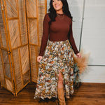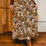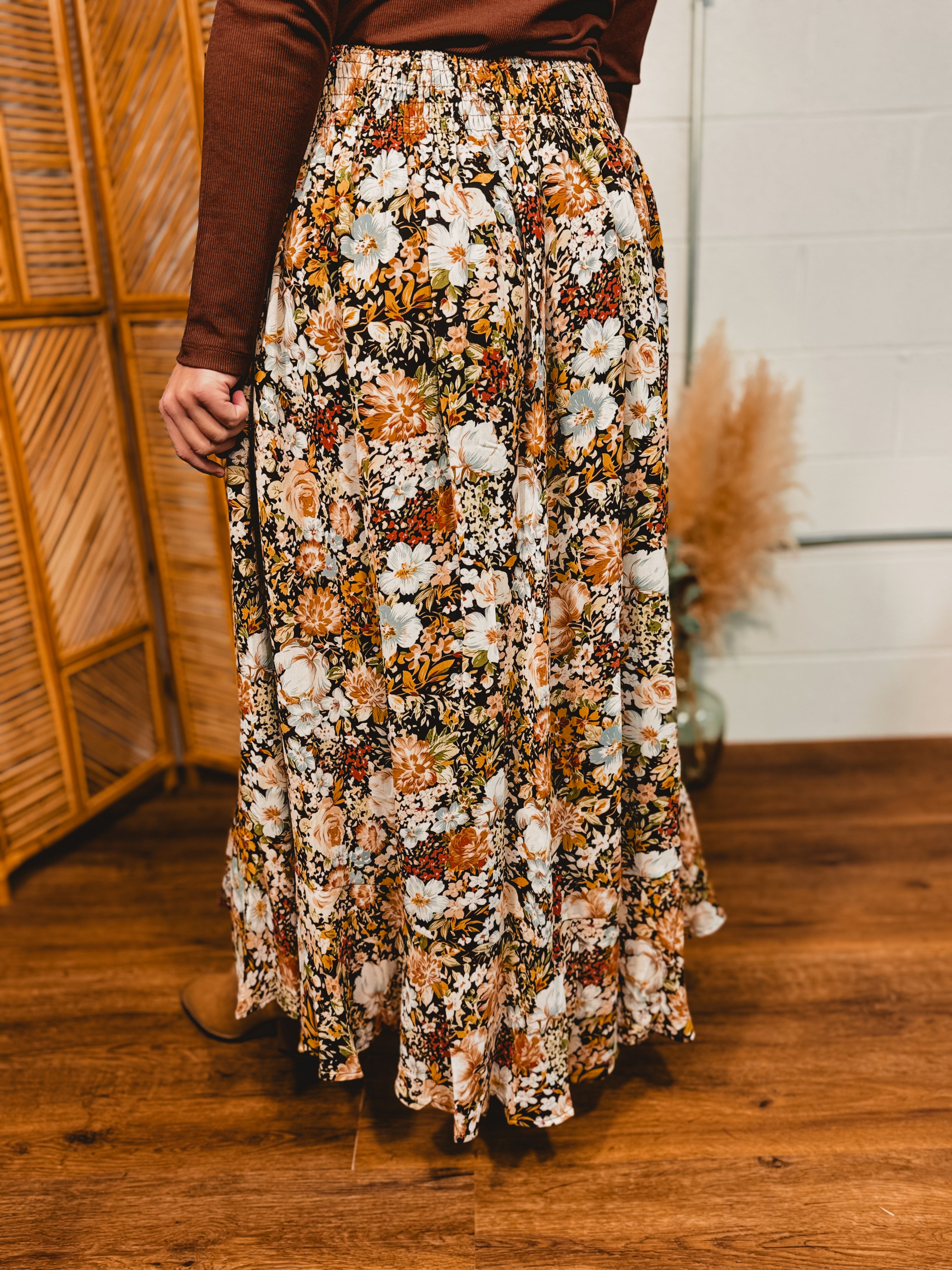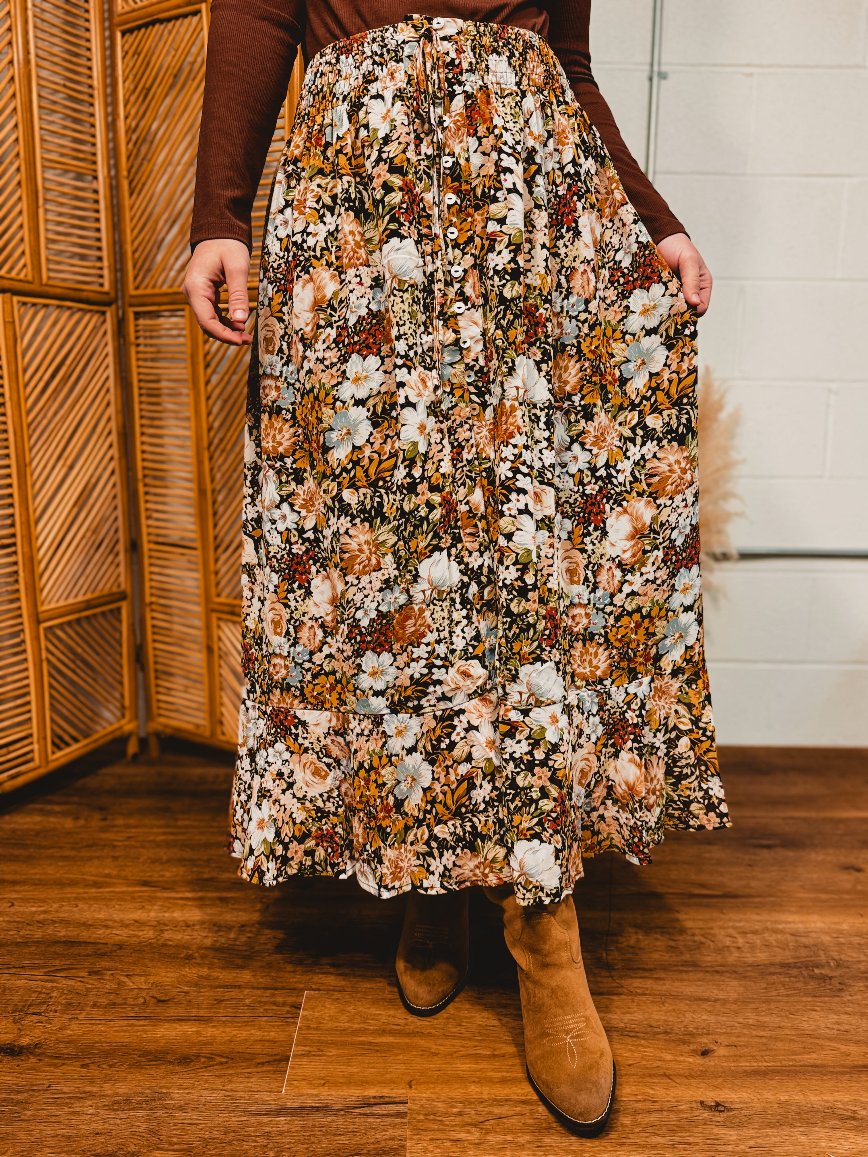Romantic, breezy, and effortlessly feminine — this floral maxi skirt is made for soft fall days and dreamy afternoons. Designed with a comfortable smocked waistband and adjustable tie, it cinches gently at the waist while the flowy woven fabric drapes beautifully with every step. A half button-front detail and front slit bring just the right touch of movement and charm, making this an easy go-to for dressing up or keeping it casual. Pair with fitted knits, bodysuits, or cropped sweaters for a look that’s equal parts relaxed and elevated.