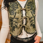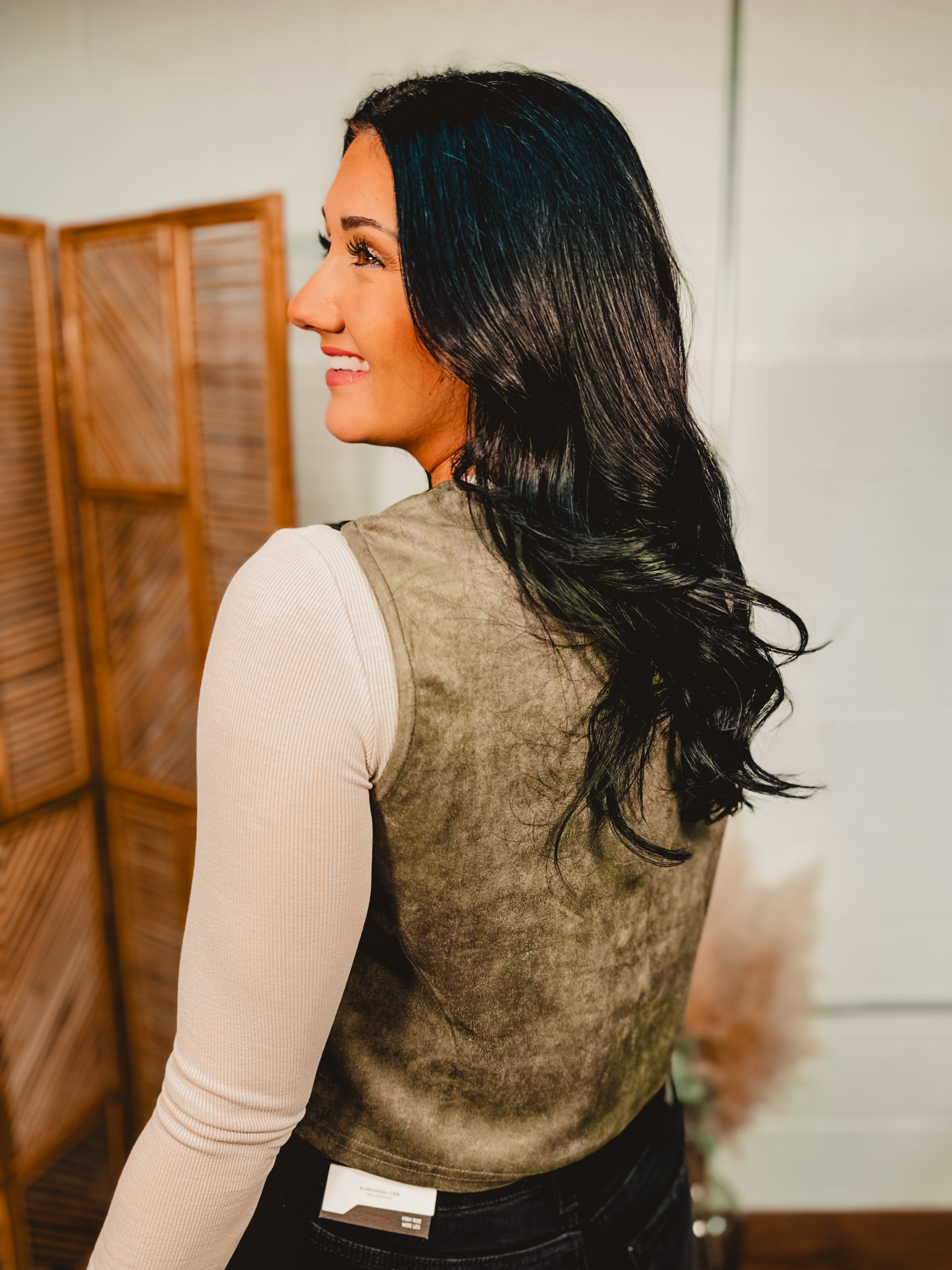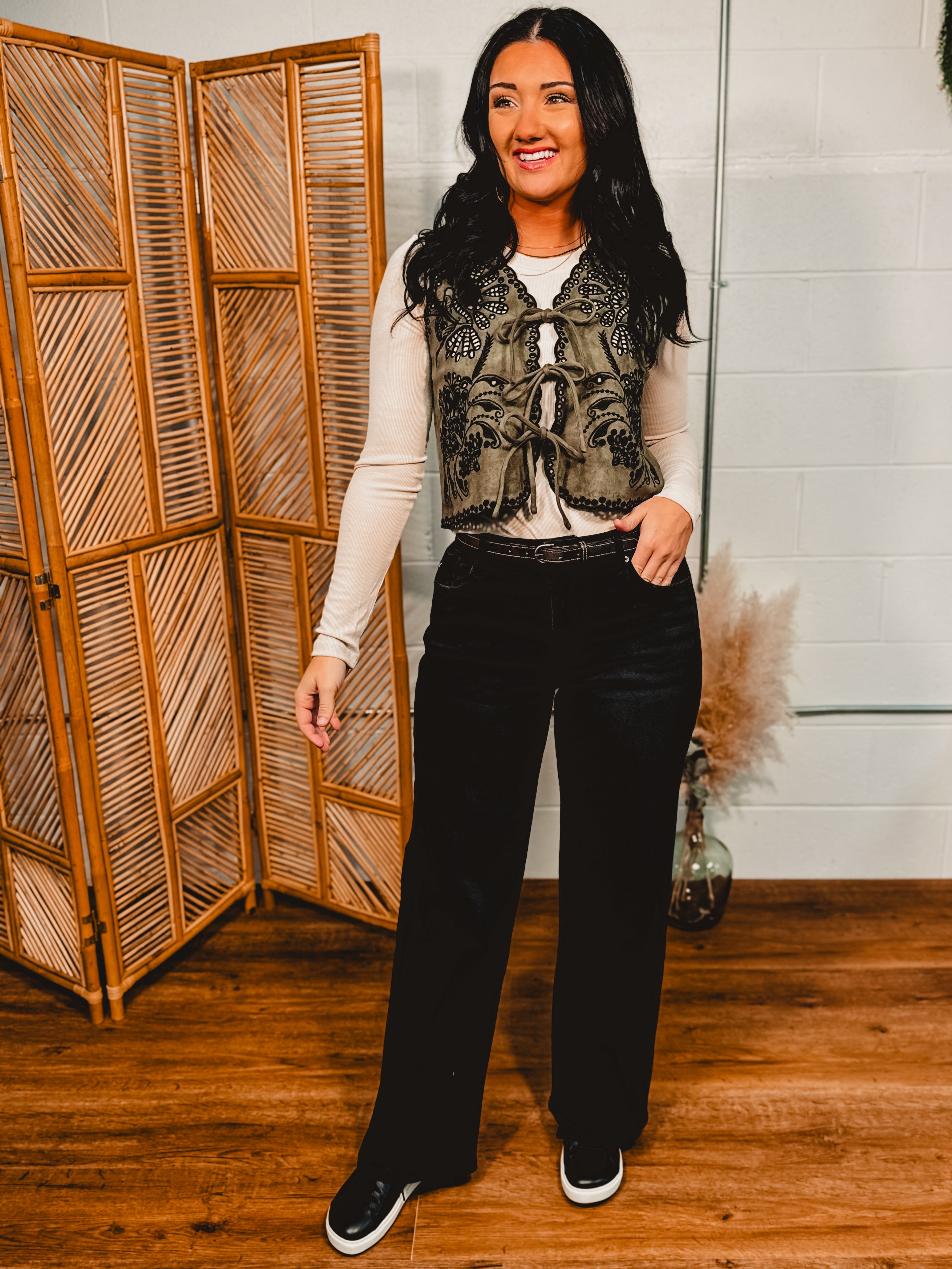 Boho and beautiful, this olive suede vest features delicate crochet accents and a flattering front tie closure for a charming layered look!