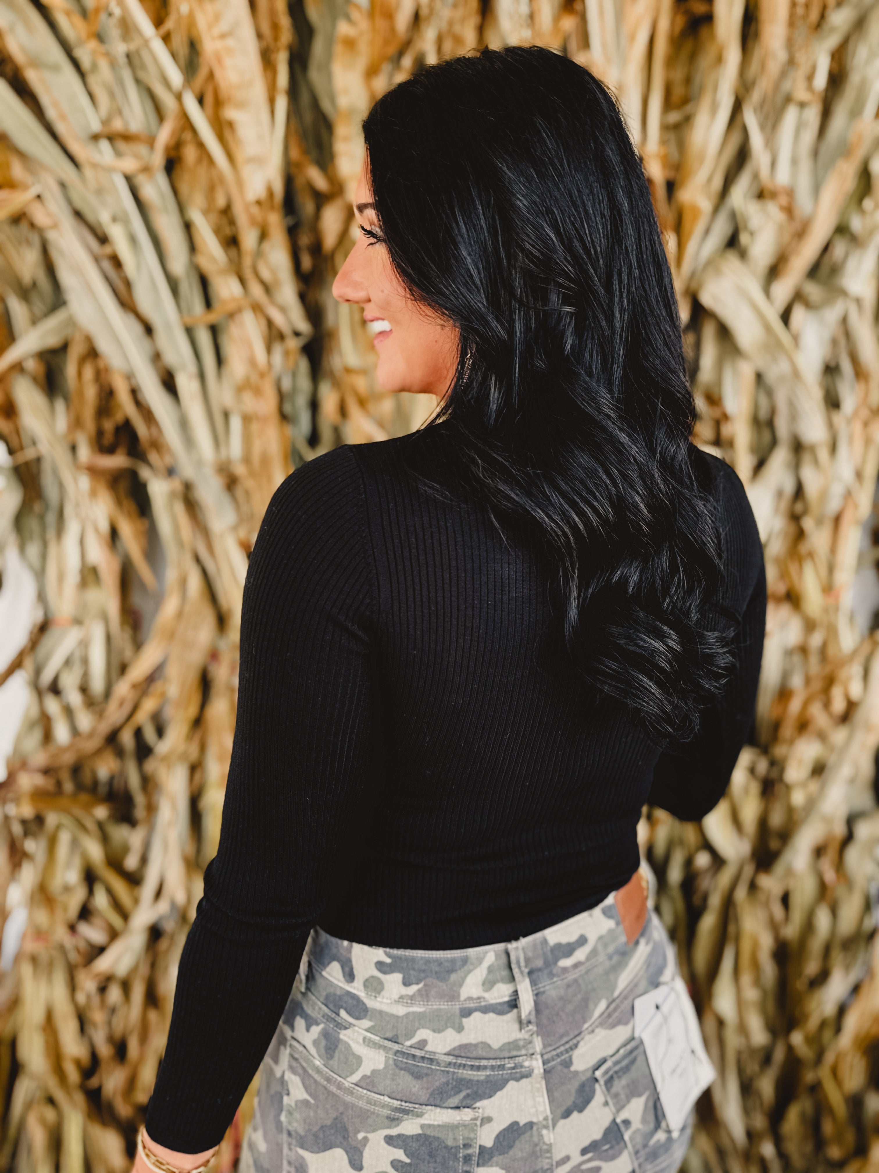 This fitted black ribbed bodysuit features a high neckline, long sleeves, and a convenient snap button closure, offering a sleek and stylish foundation for any outfit. Its versatile design enhances your silhouette while providing all-day comfort.