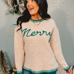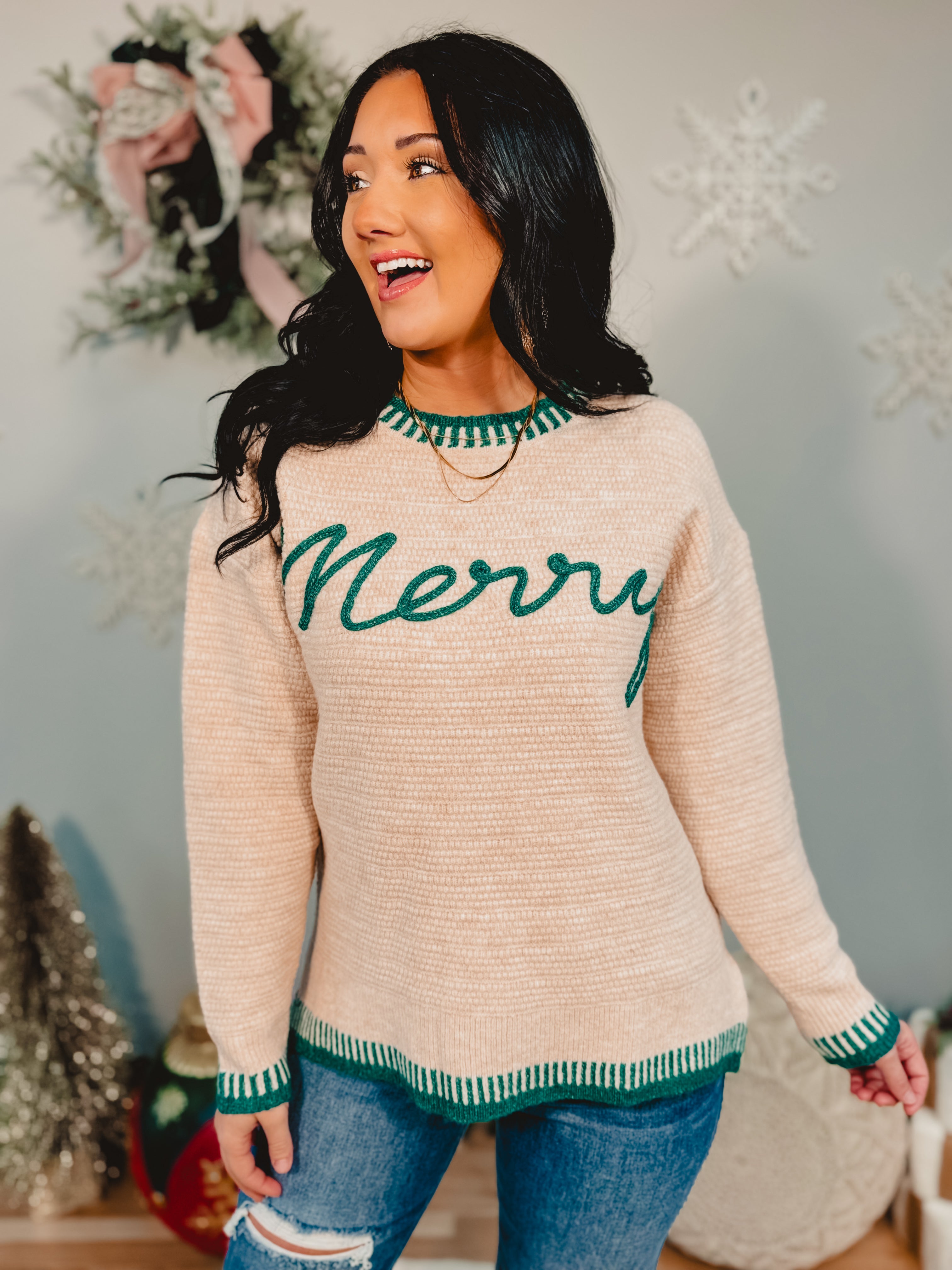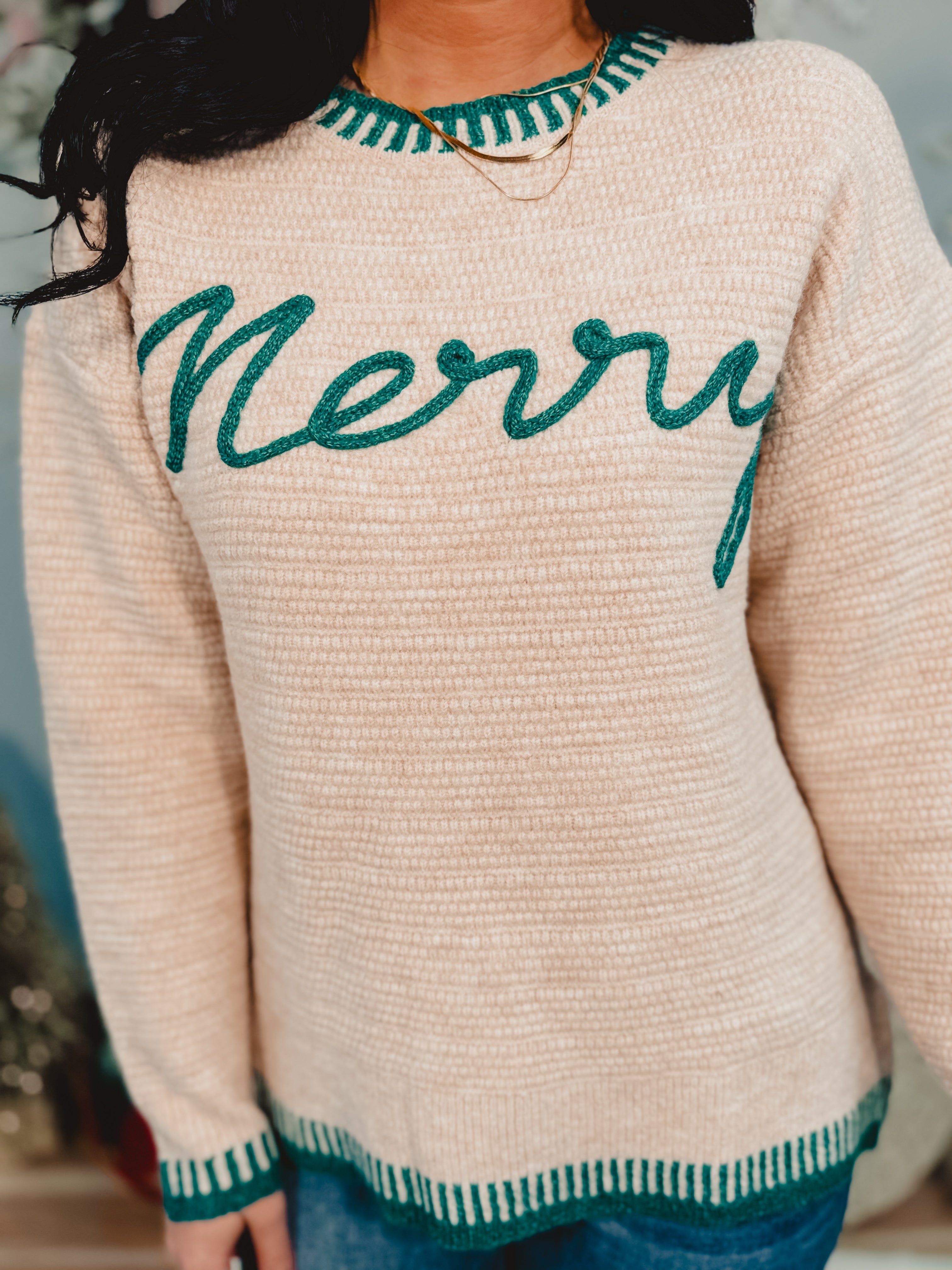 Merry Christmas Embroidery Textured Sweater - Oatmeal/Green