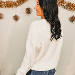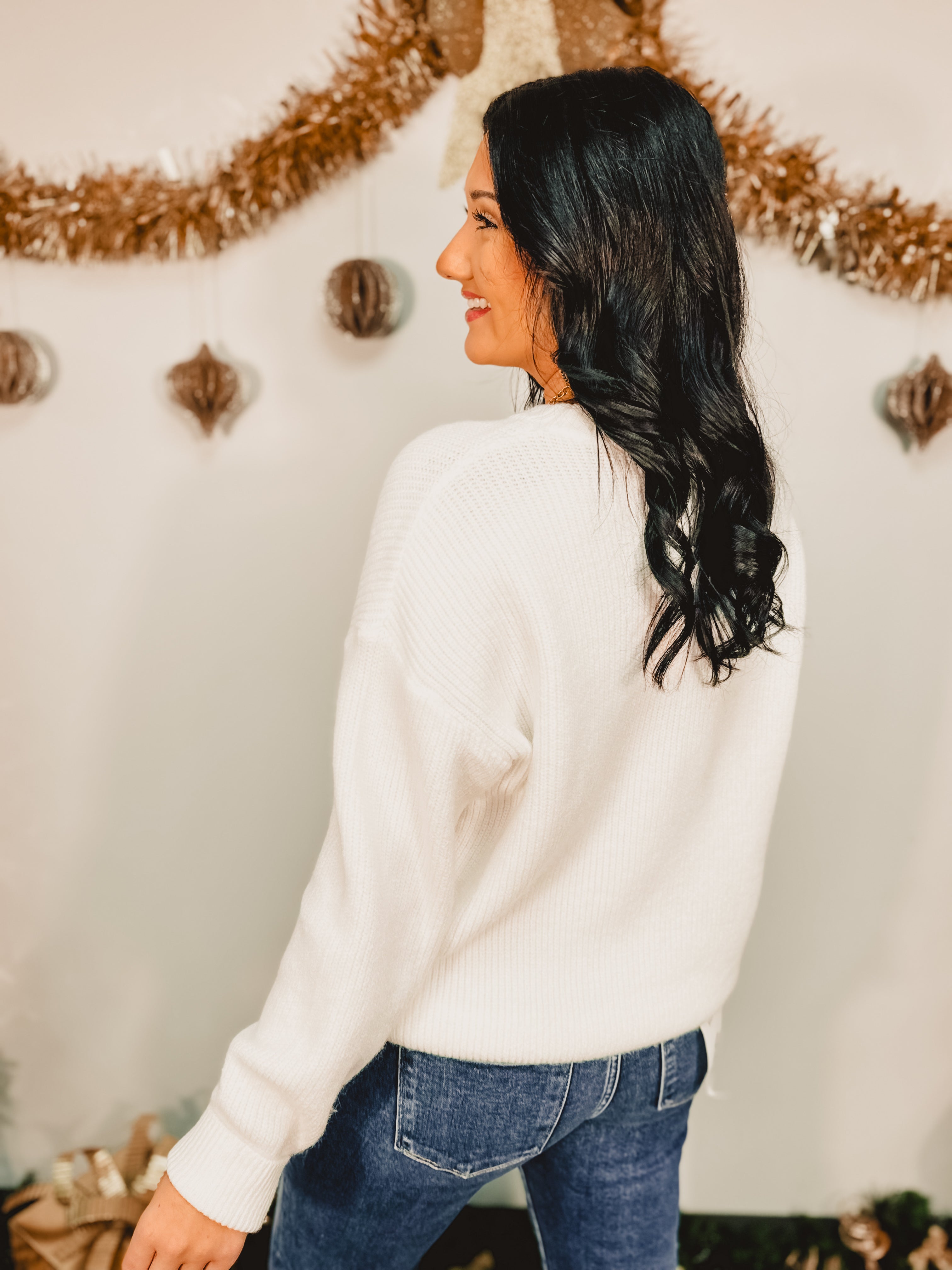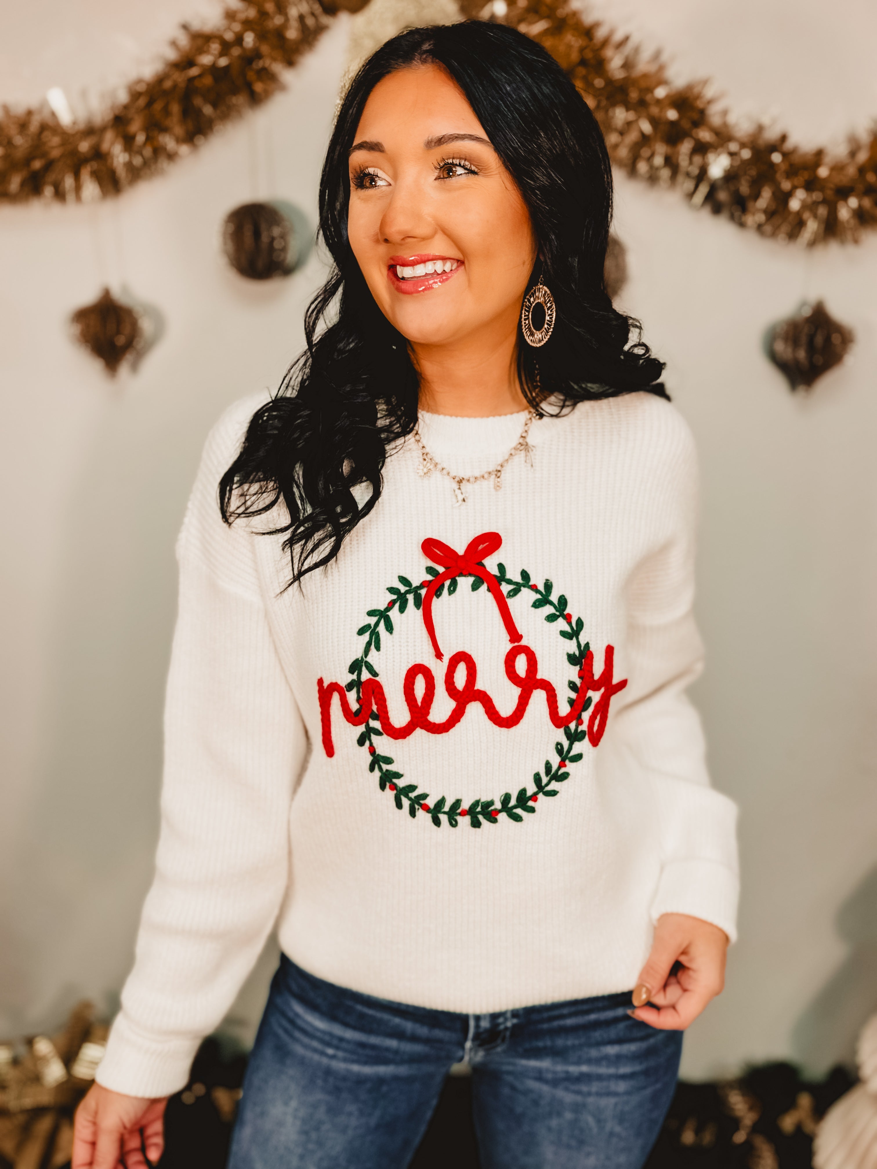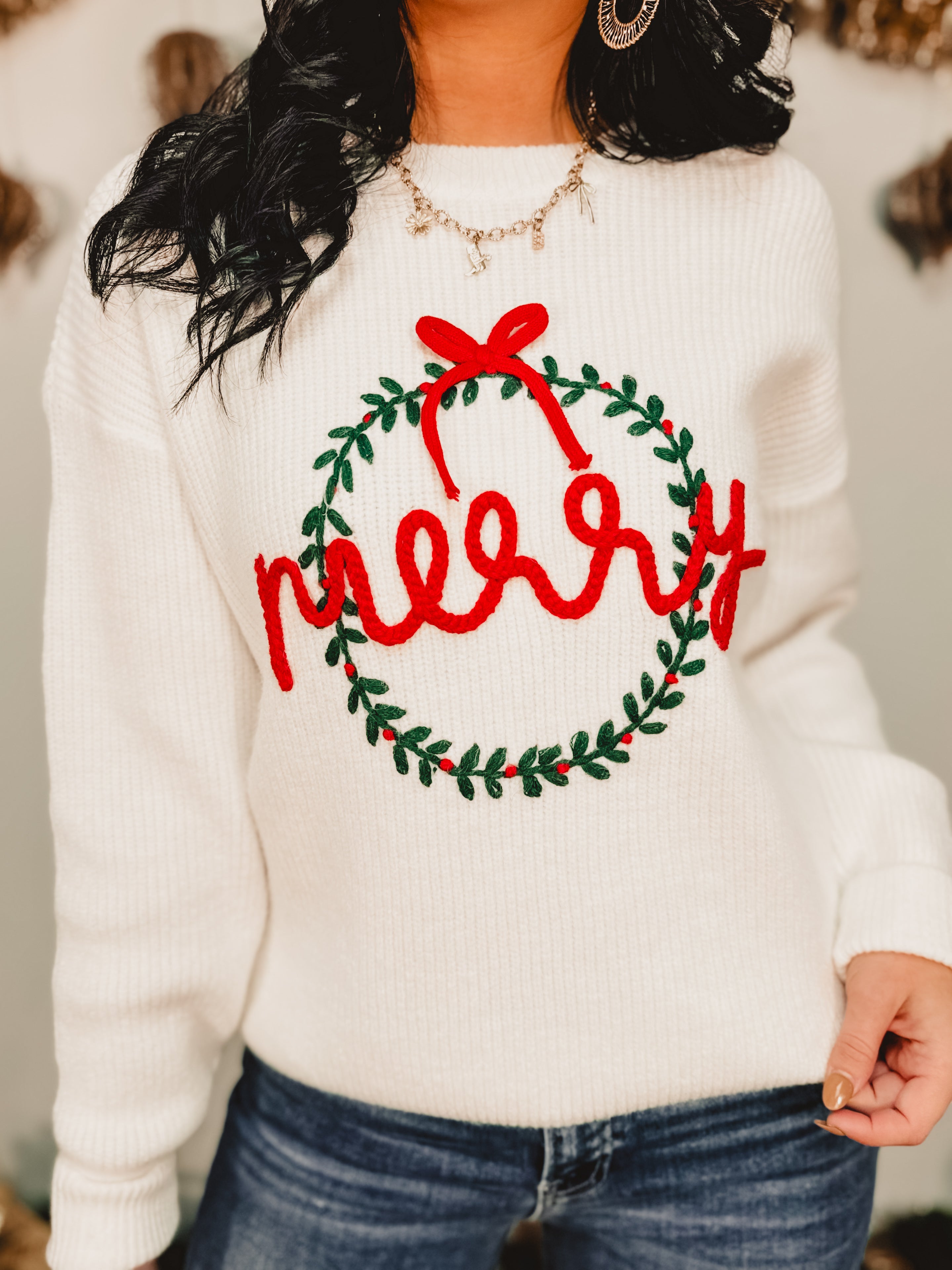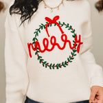 Sweet and festive, this white knit sweater features a charming wreath and bow design that brings classic Christmas cheer to your cozy holiday lineup!