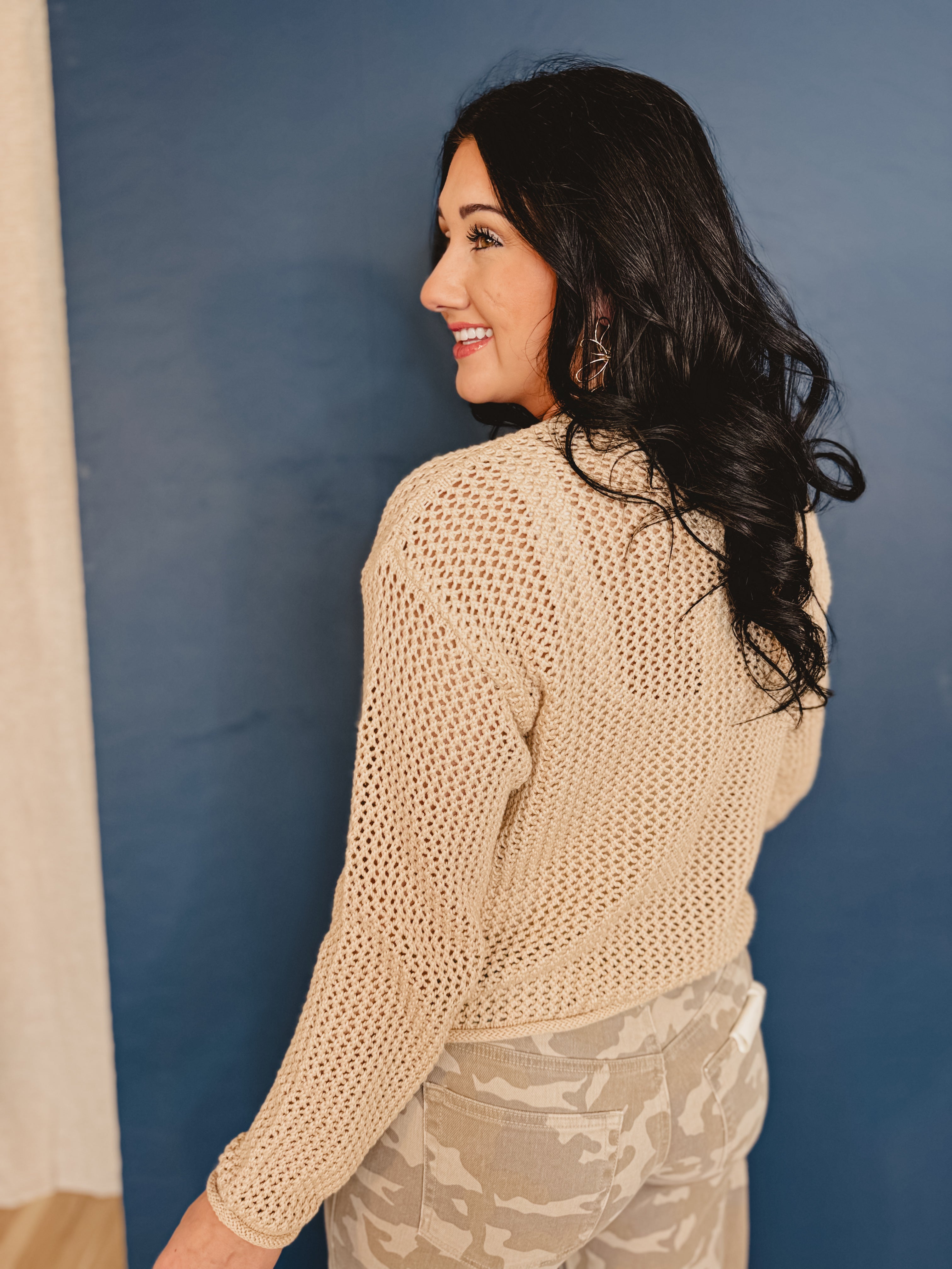 This open-knit cardigan is a cozy layering piece with a lightweight feel. Designed with a classic silhouette, it’s perfect for transitional weather and easy styling.