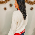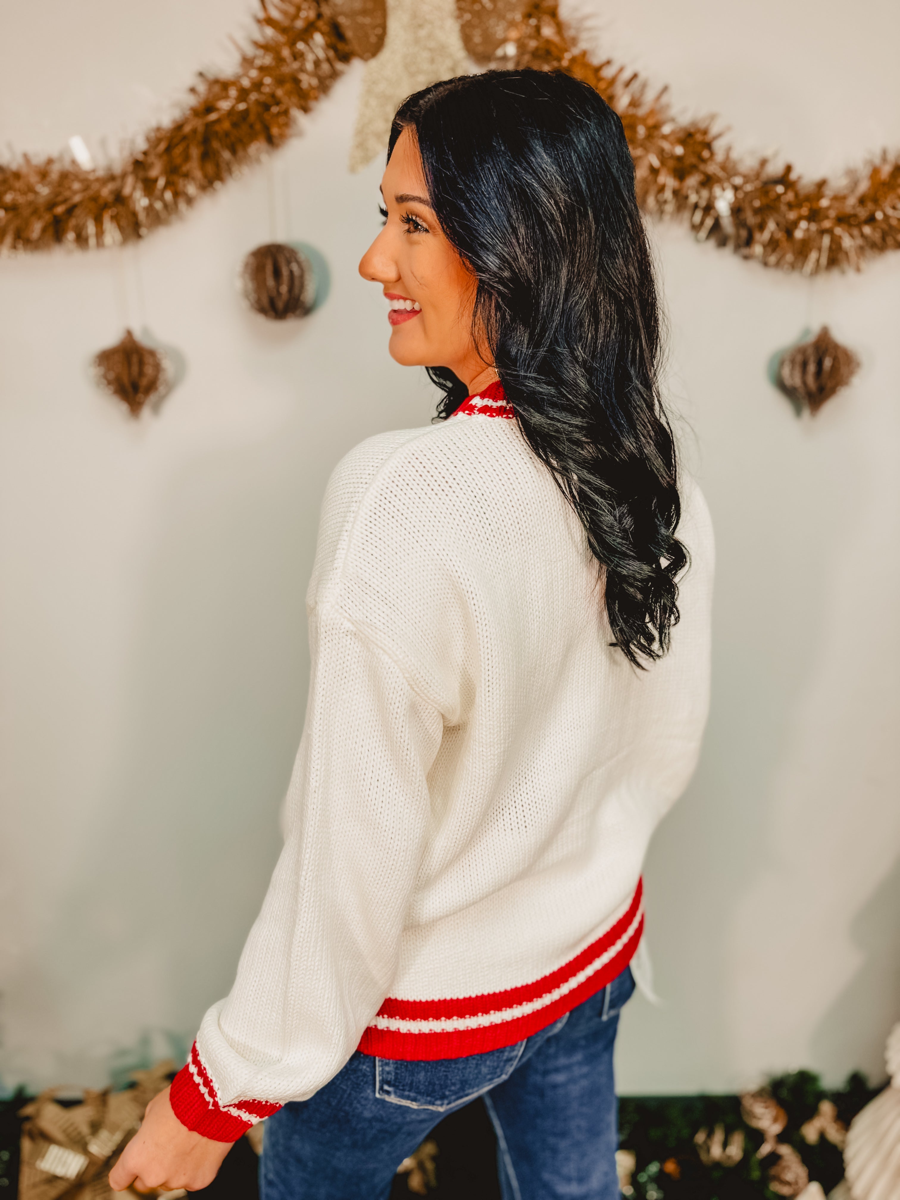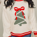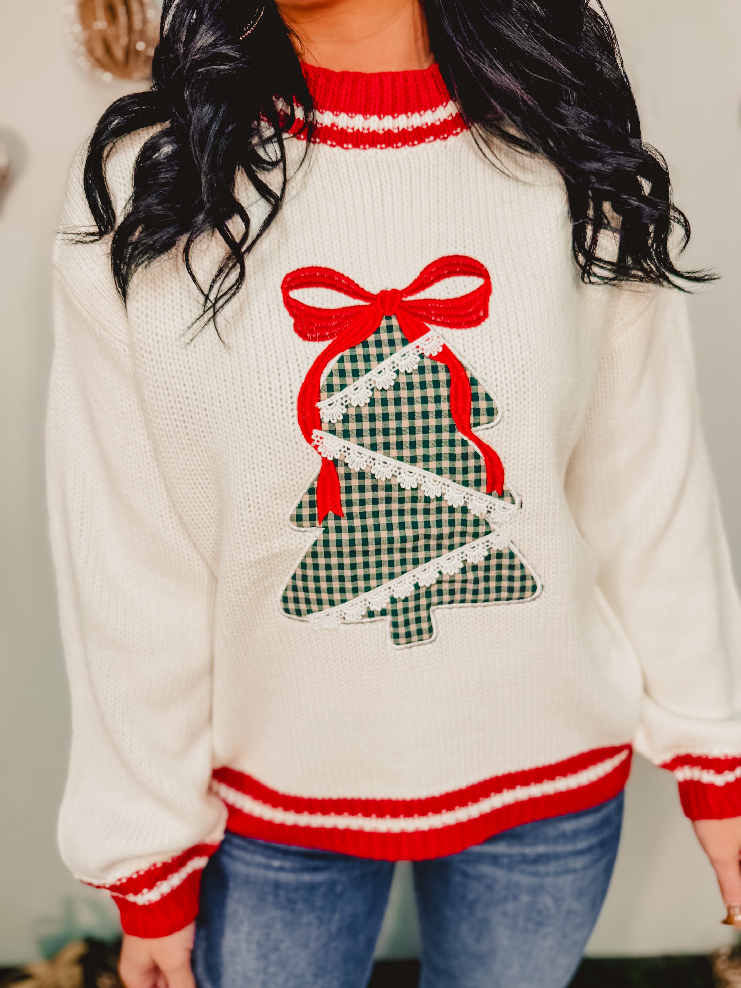 Classic and cozy, this white knit crewneck features a charming plaid Christmas tree design, bringing a timeless touch to your holiday wardrobe!