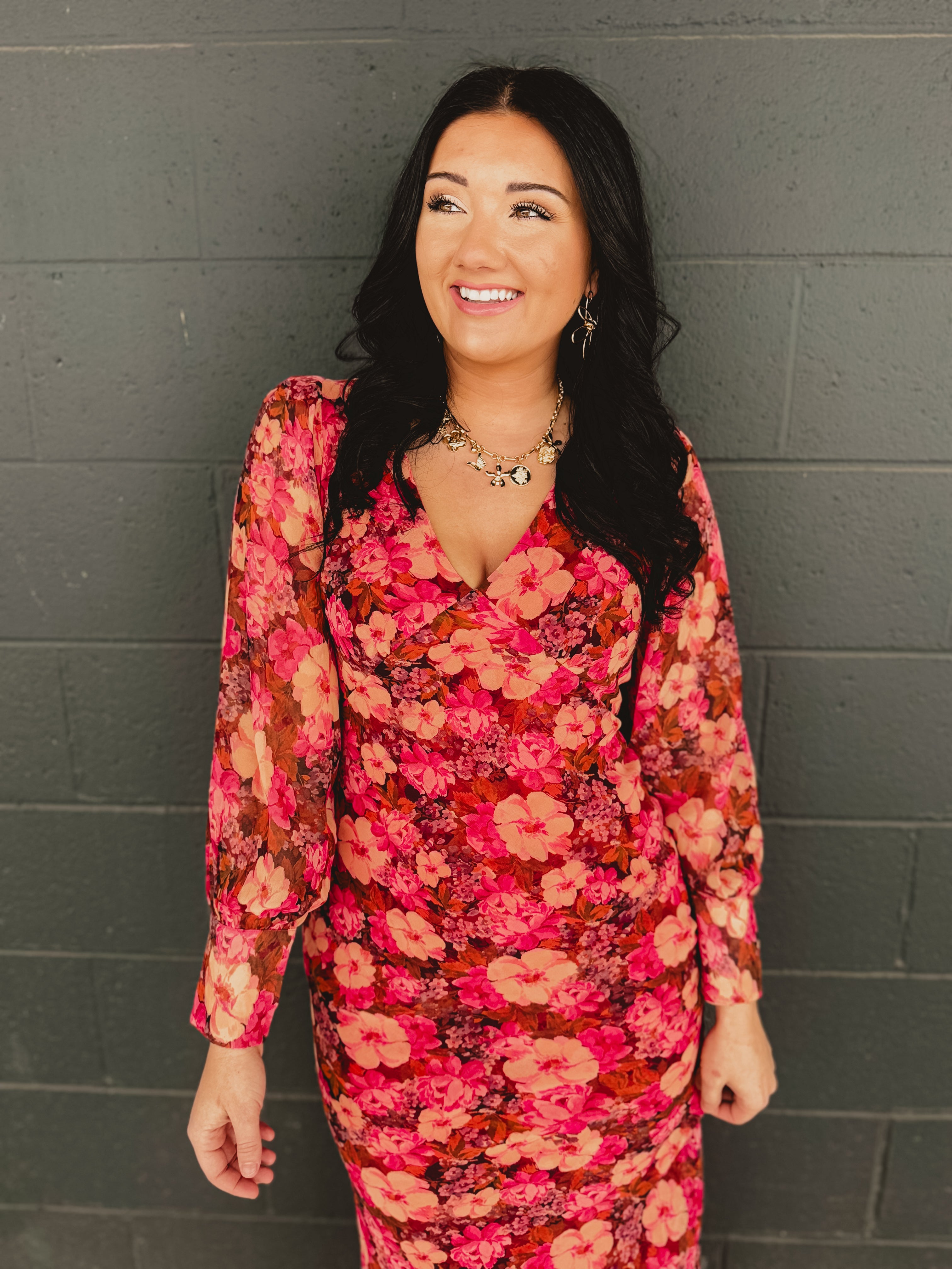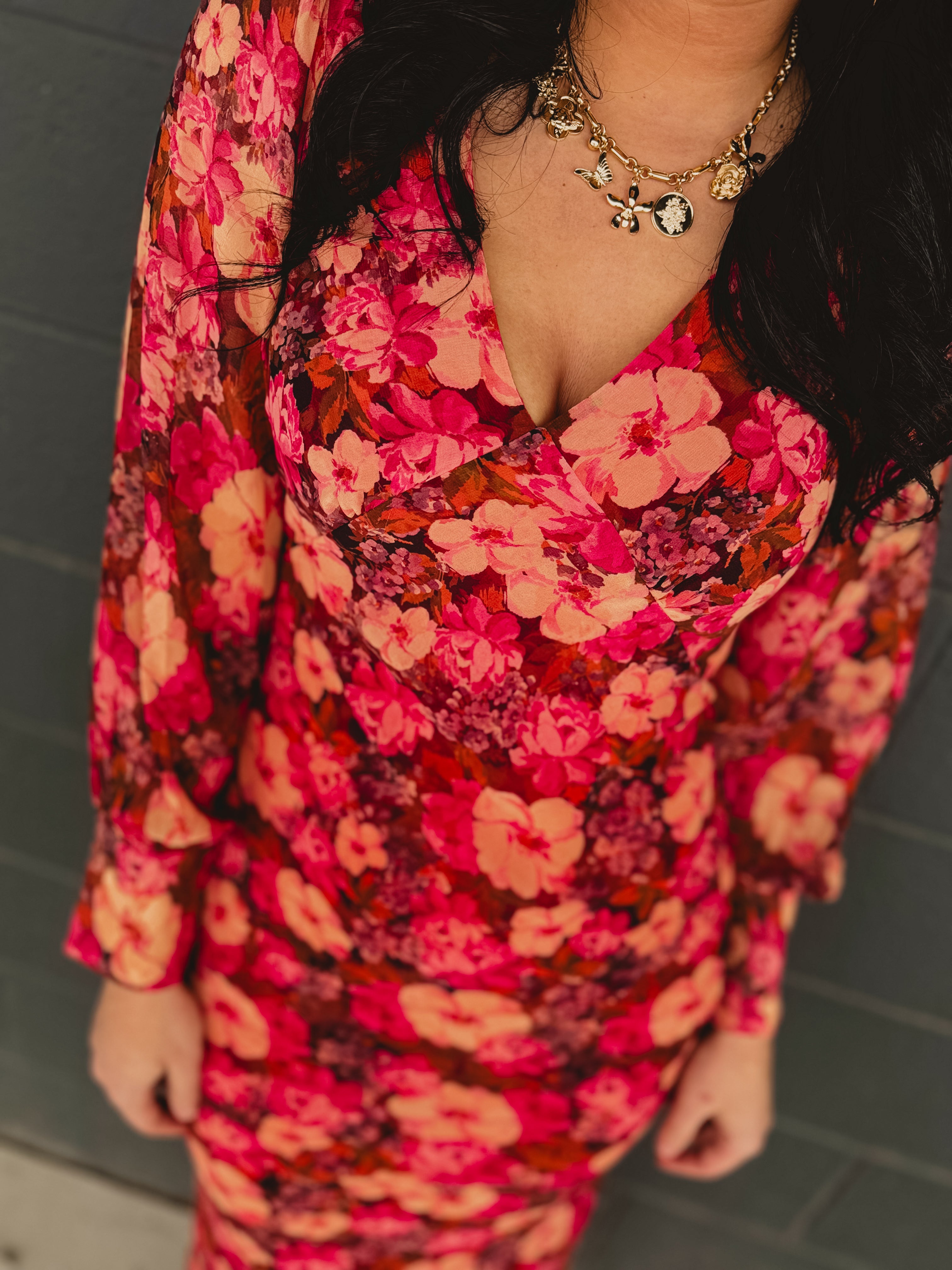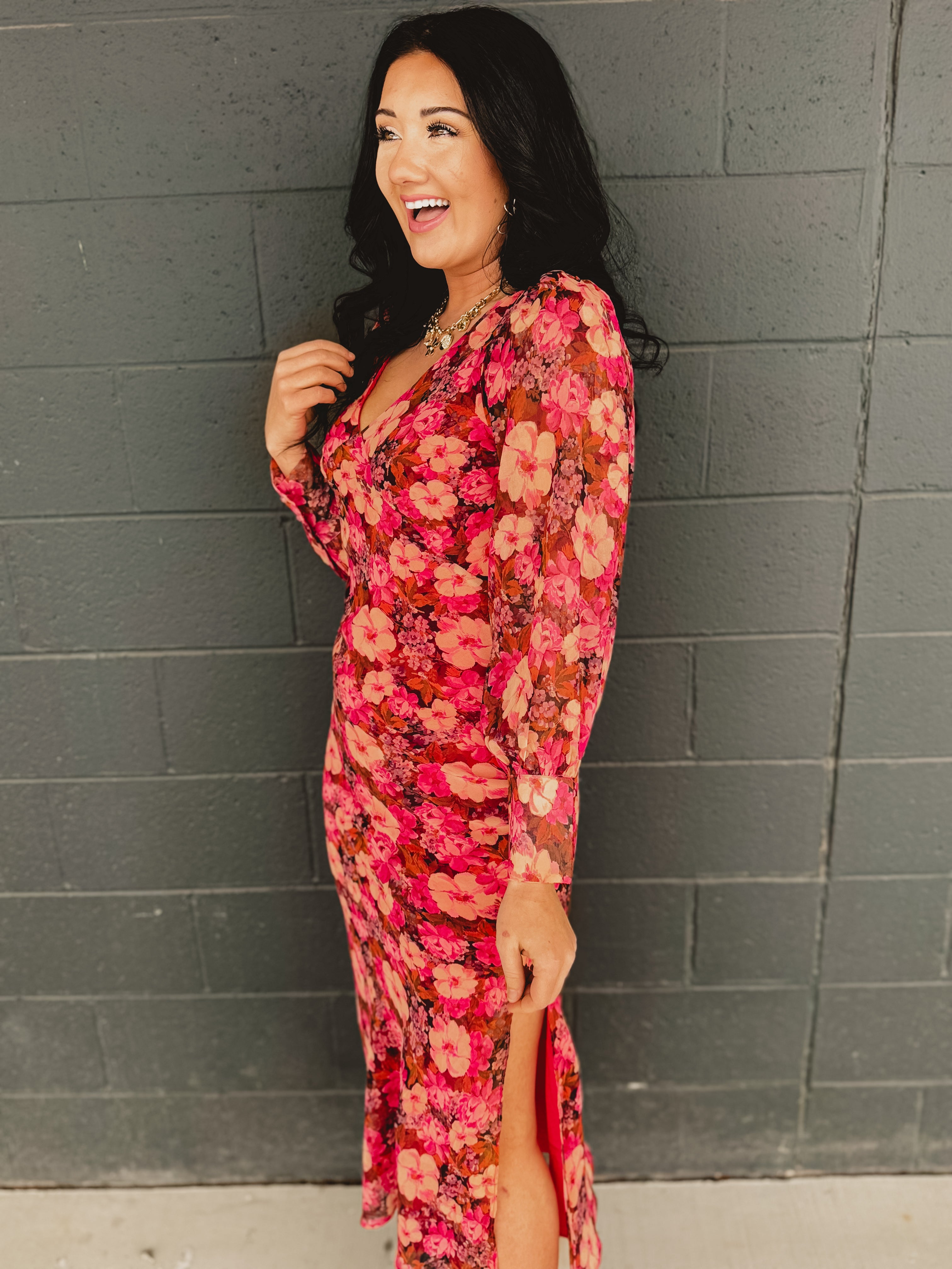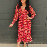Plunging V-Neck Long Sleeve Maxi Dress - Carmine Rose