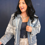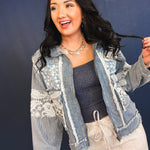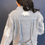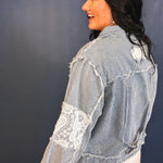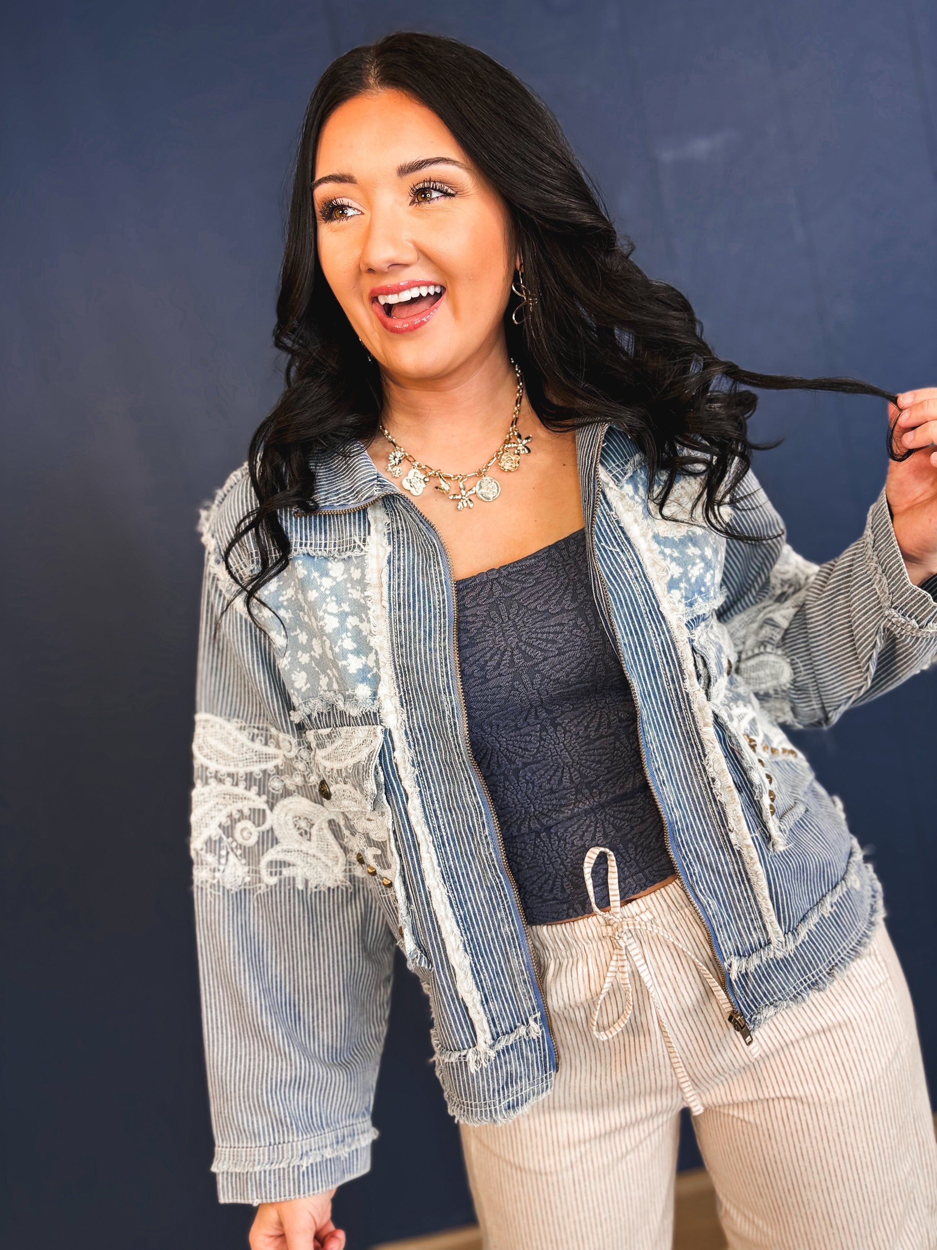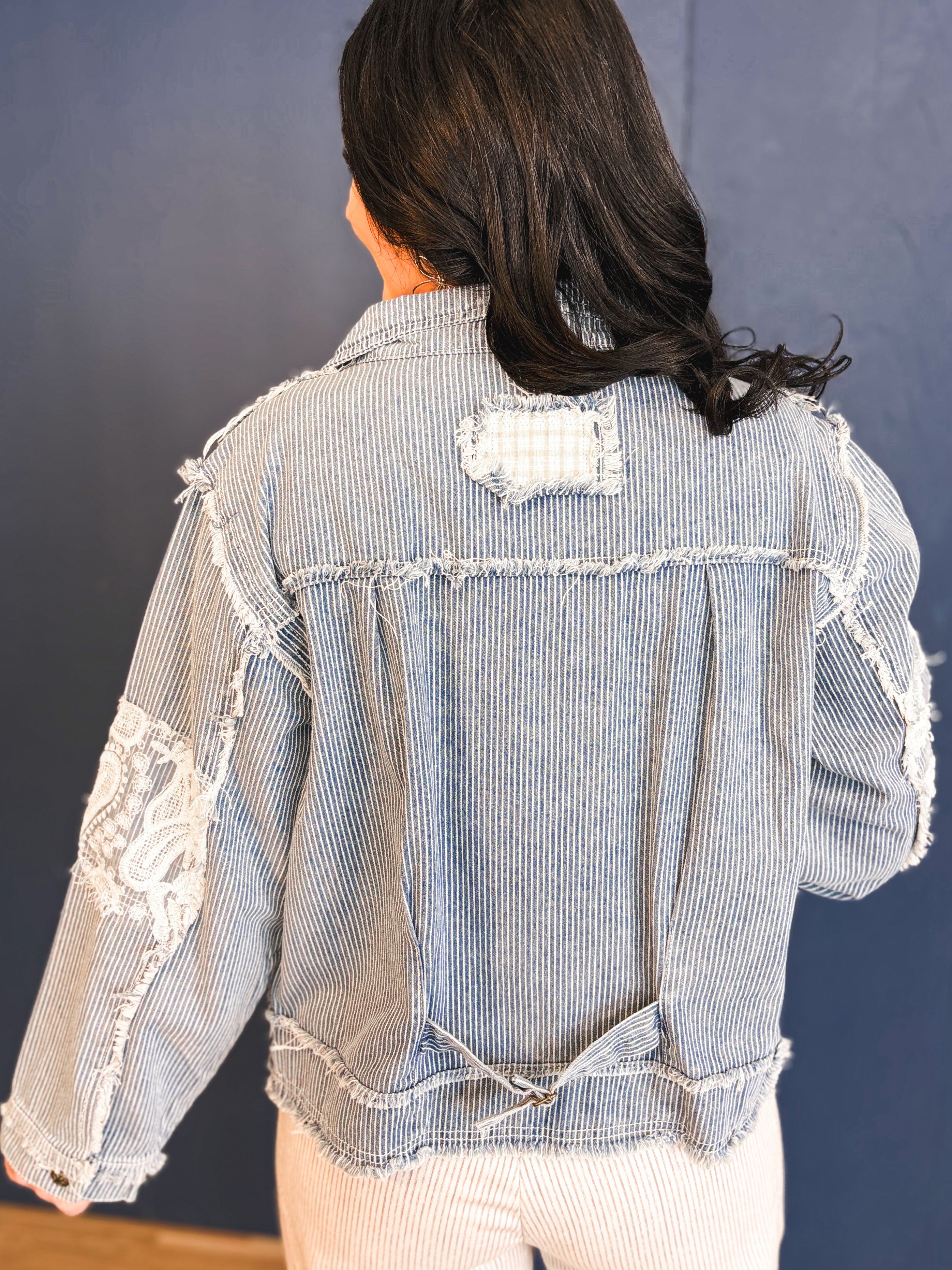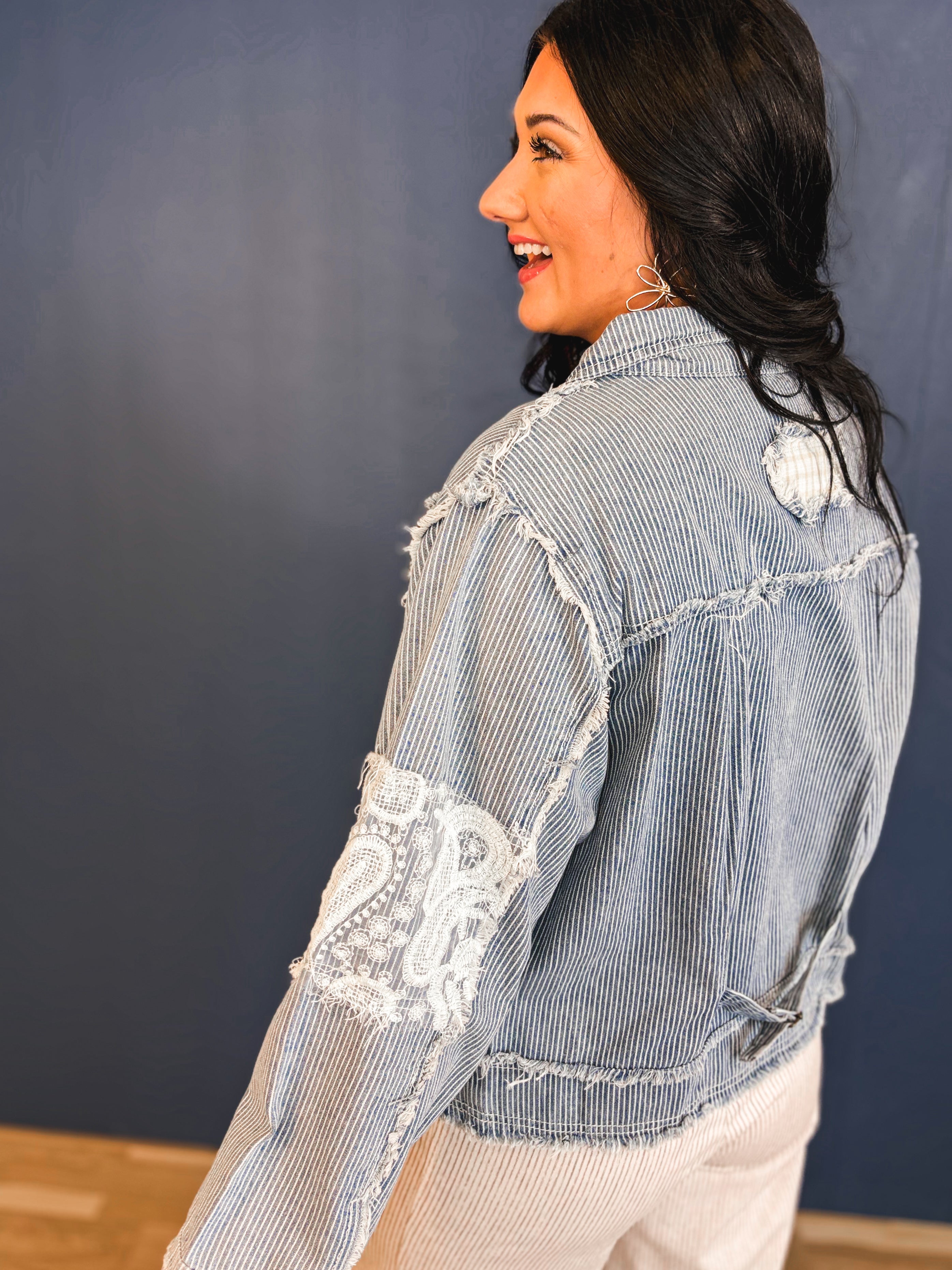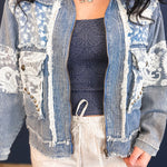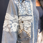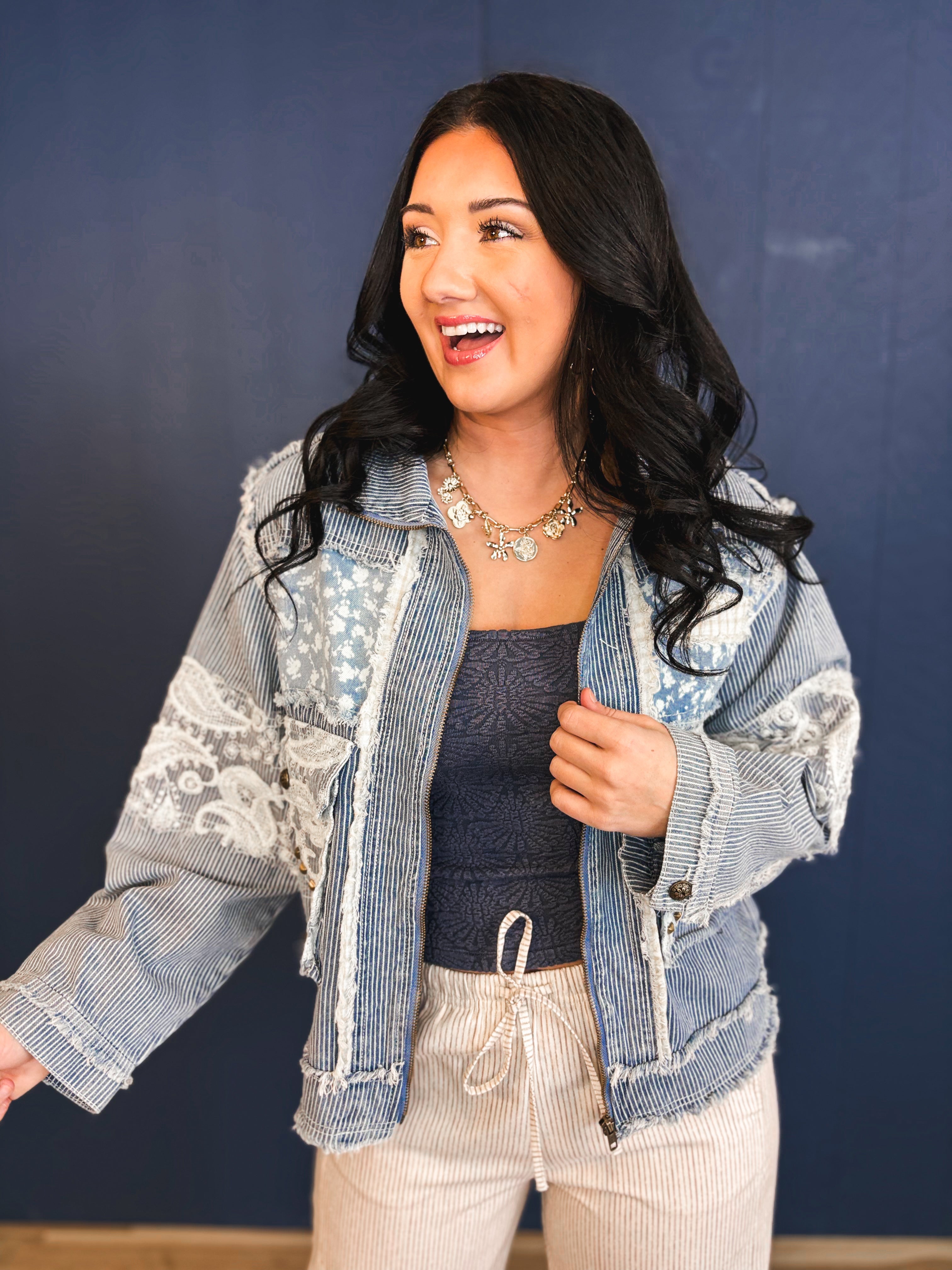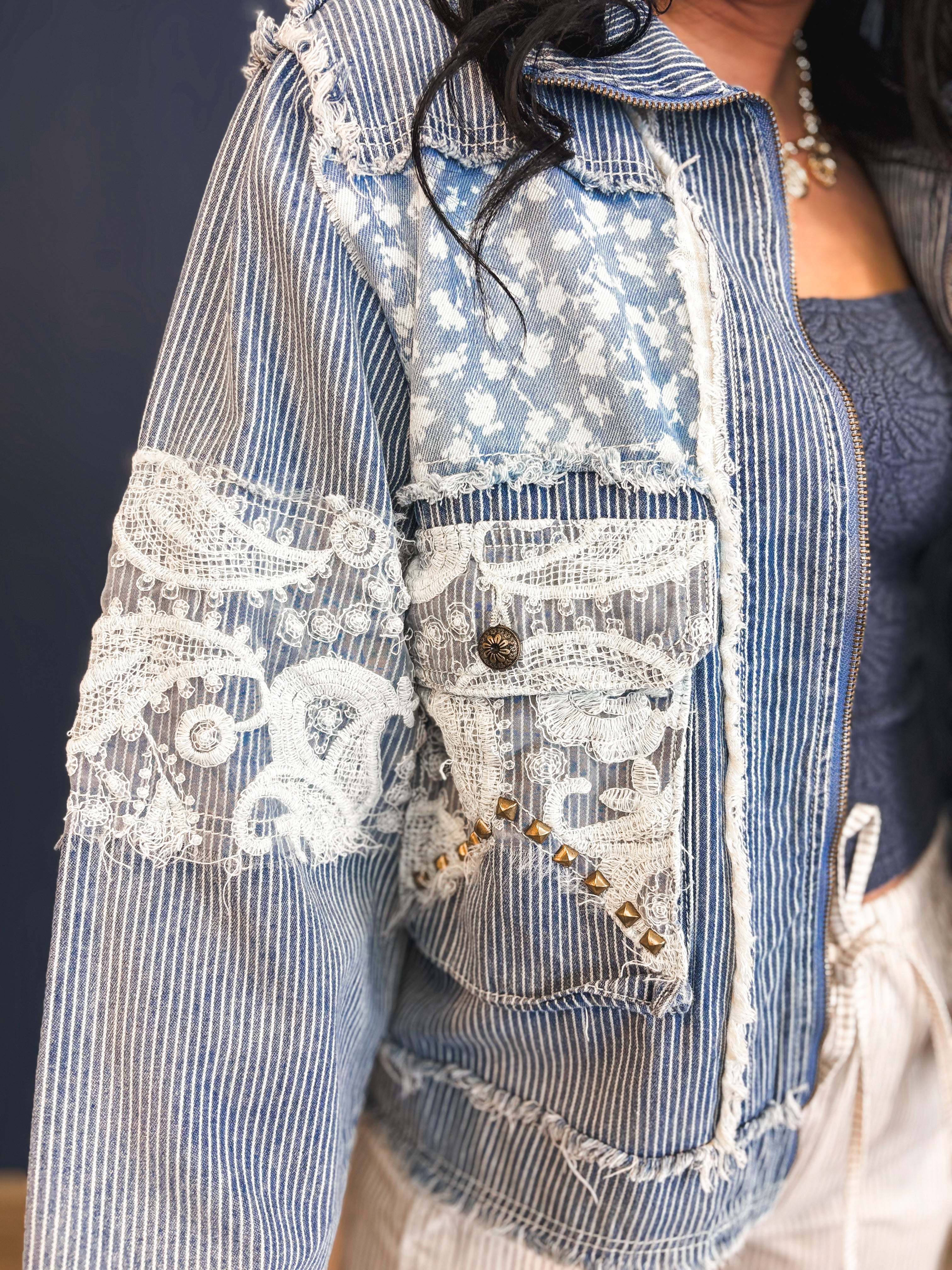 This statement jacket blends texture and detail for a standout layered look. Crafted from printed twill with unique patchwork accents, it’s designed to elevate everyday outfits with ease.