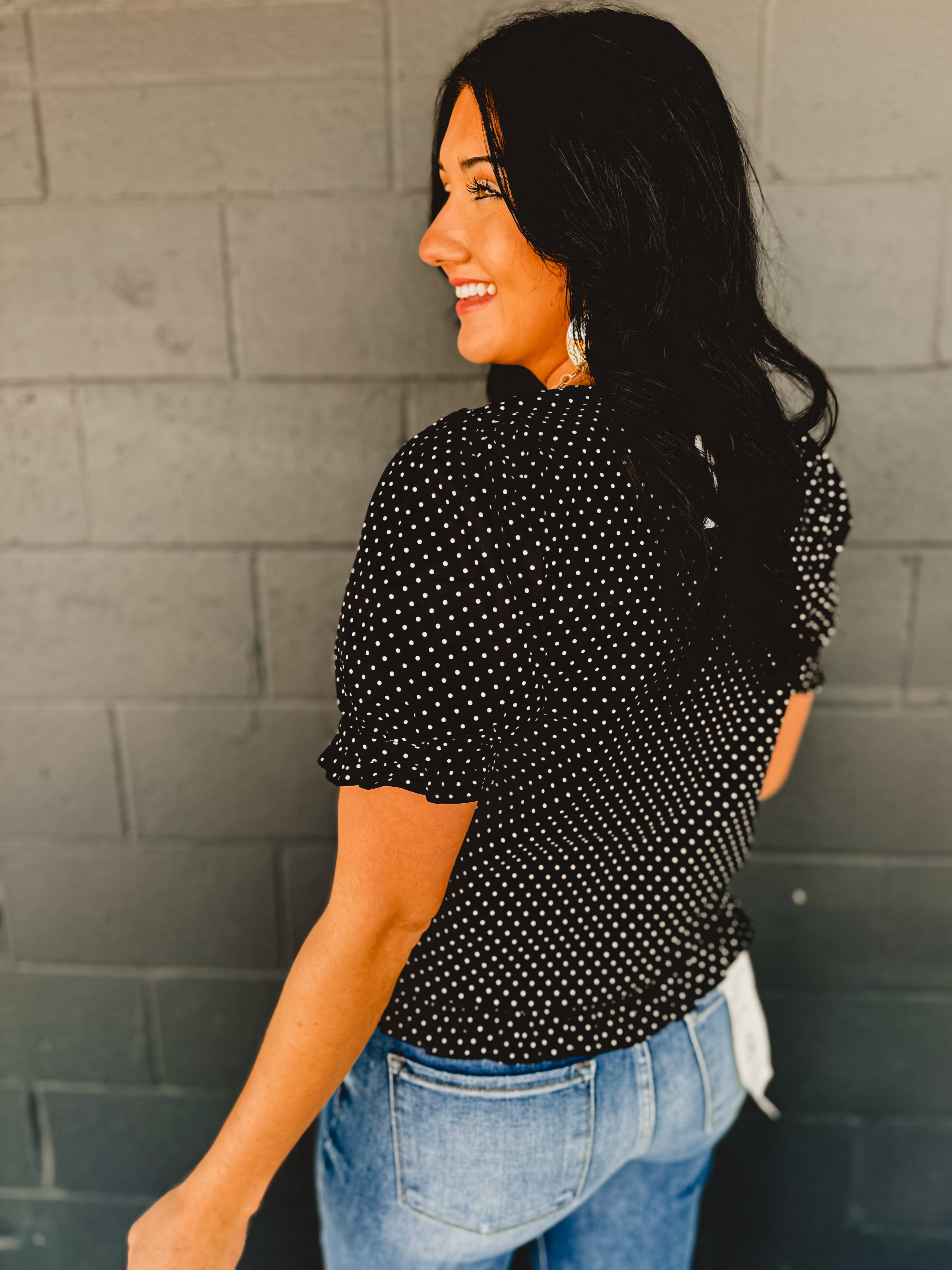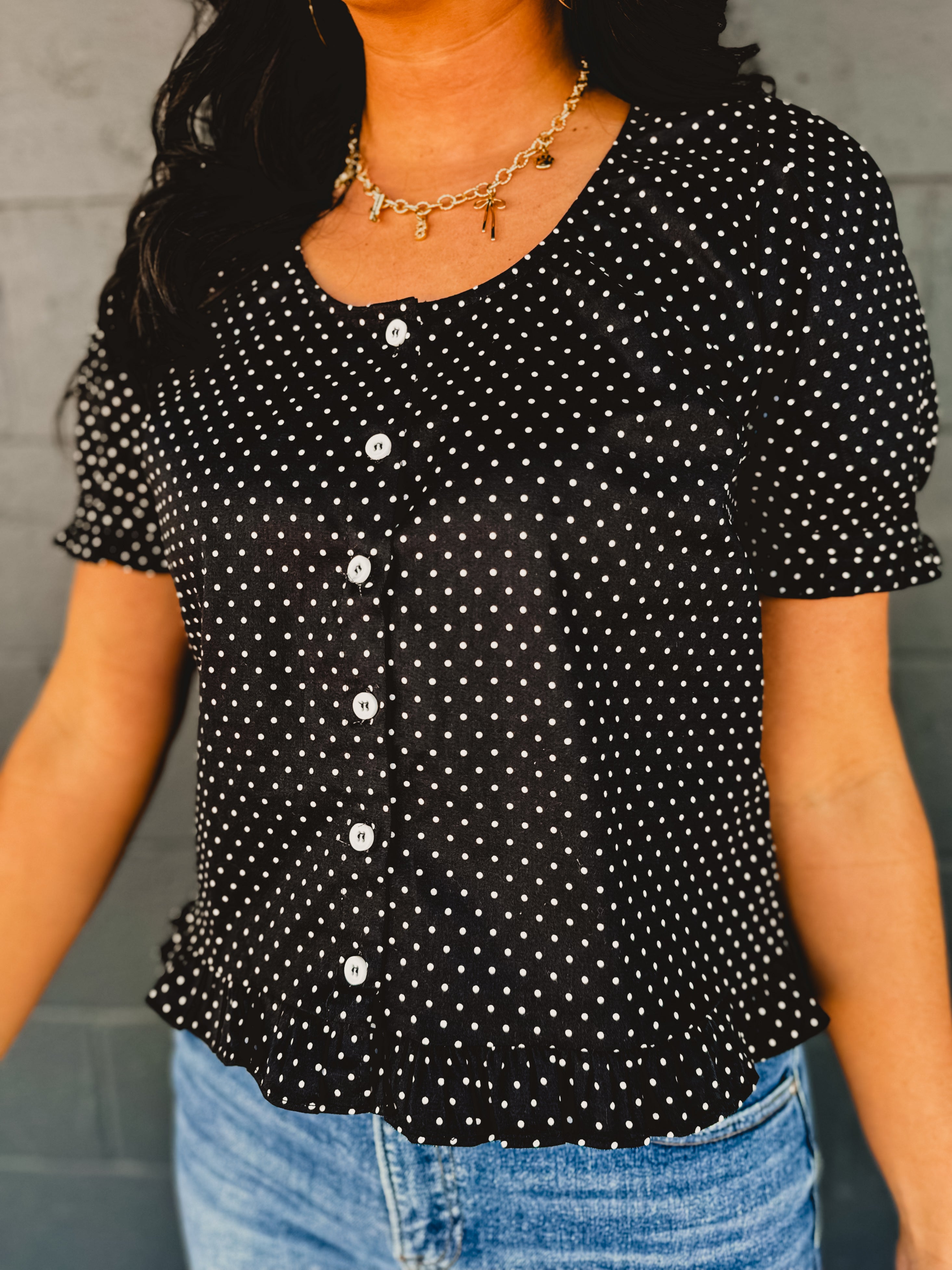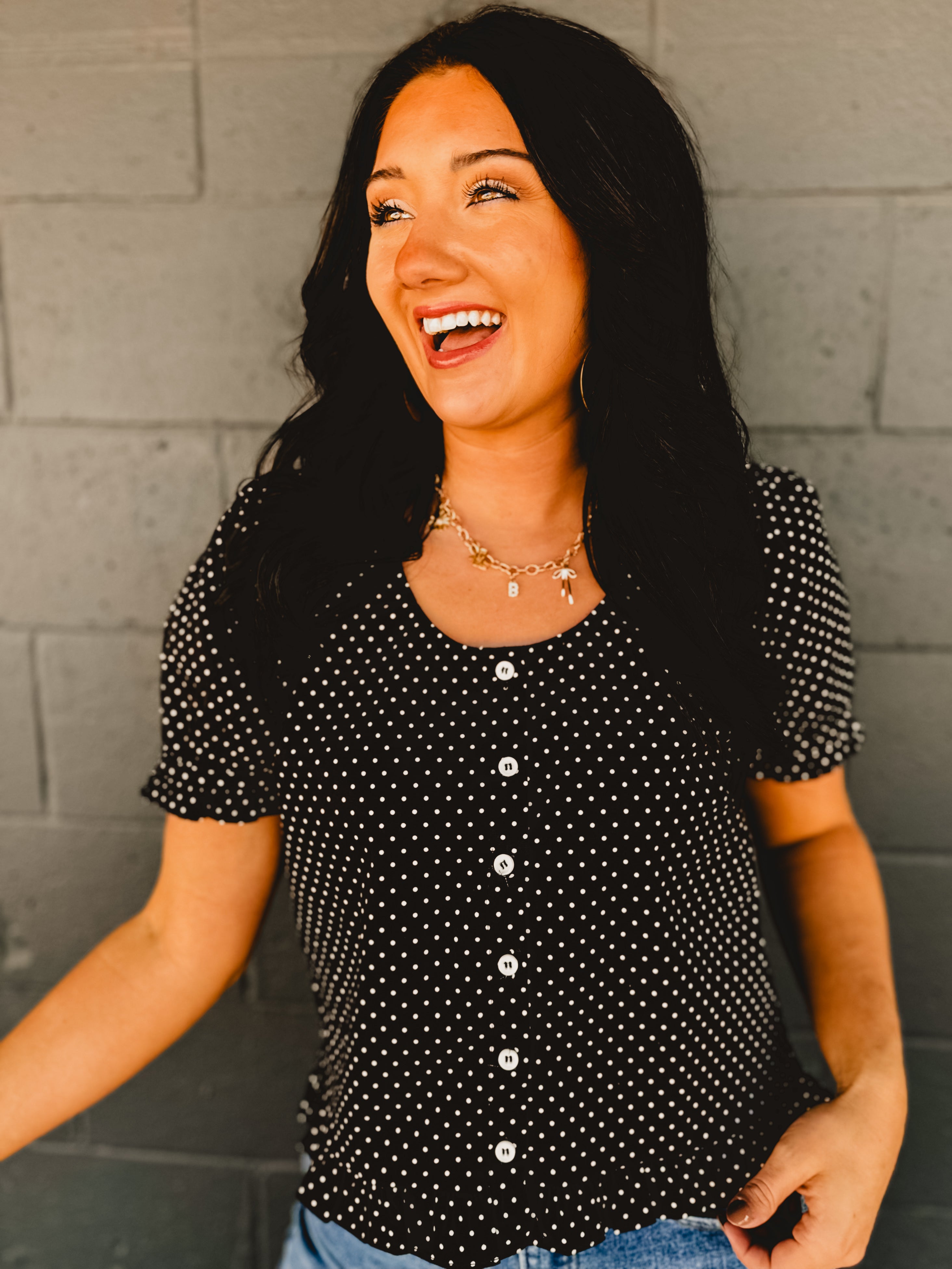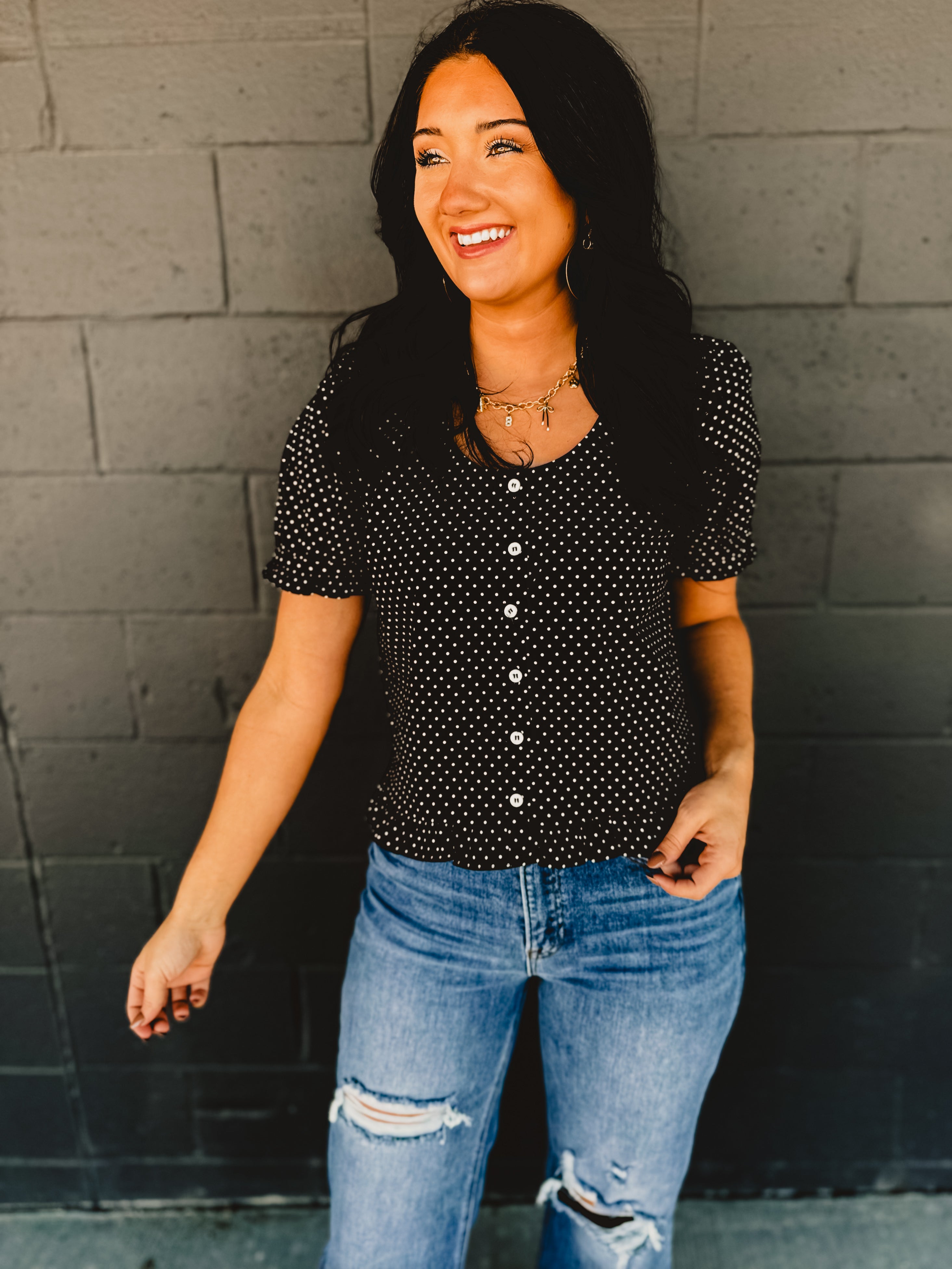 Playful yet polished, this black and white button up blouse features a classic polka dot print for a timeless look that transitions effortlessly from work to weekend. Dress it up or down!