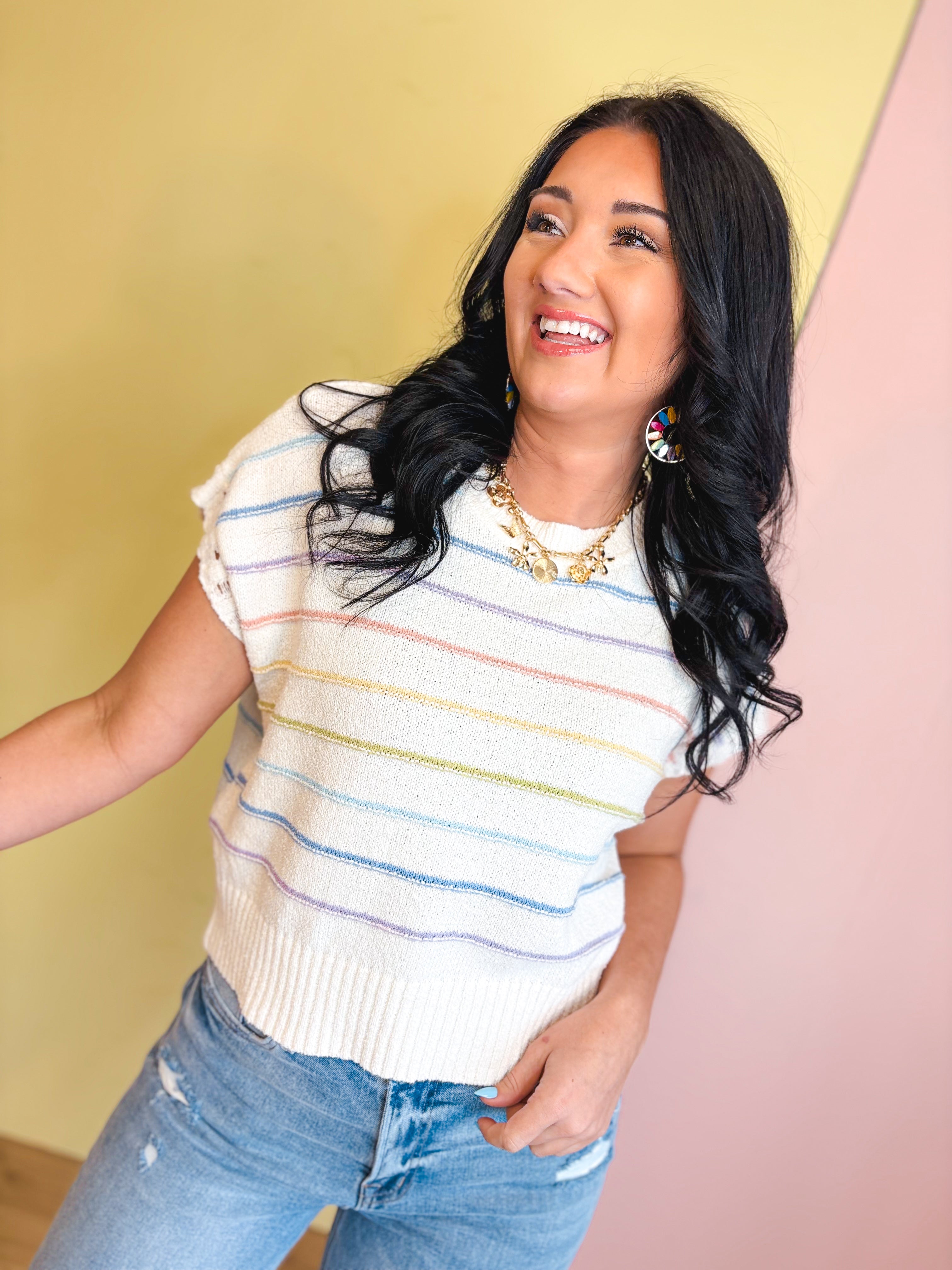 Add a pop of color to your seasonal wardrobe with this multi color stripe sleeve crew neck sweater. Lightweight and stylish, it’s perfect for spring and summer layering.