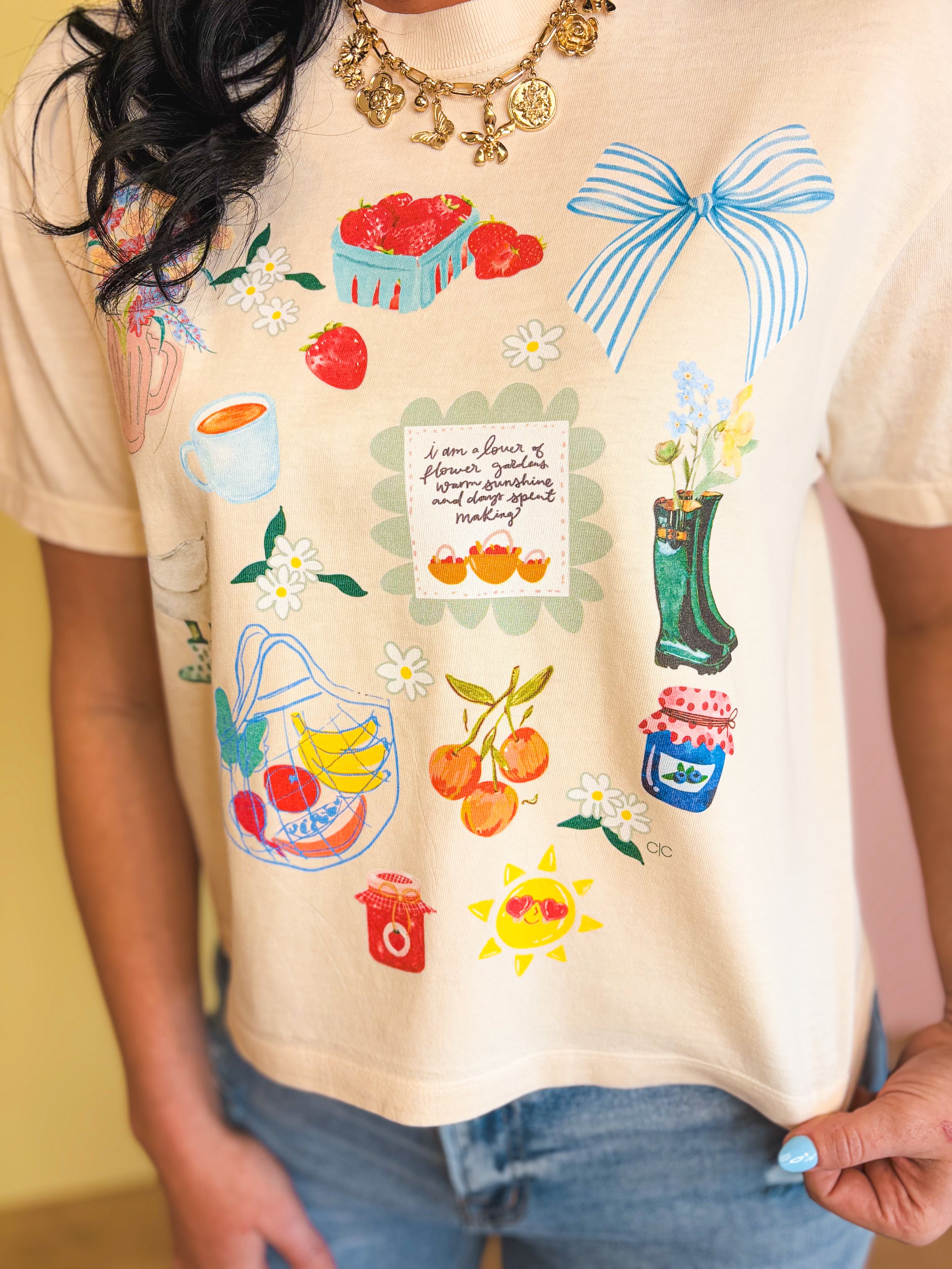 This summer collage crop tee brings a bright, positive vibe to your warm-weather wardrobe. Designed with a subtle cropped length, it’s easy to style and perfect for sunny days!