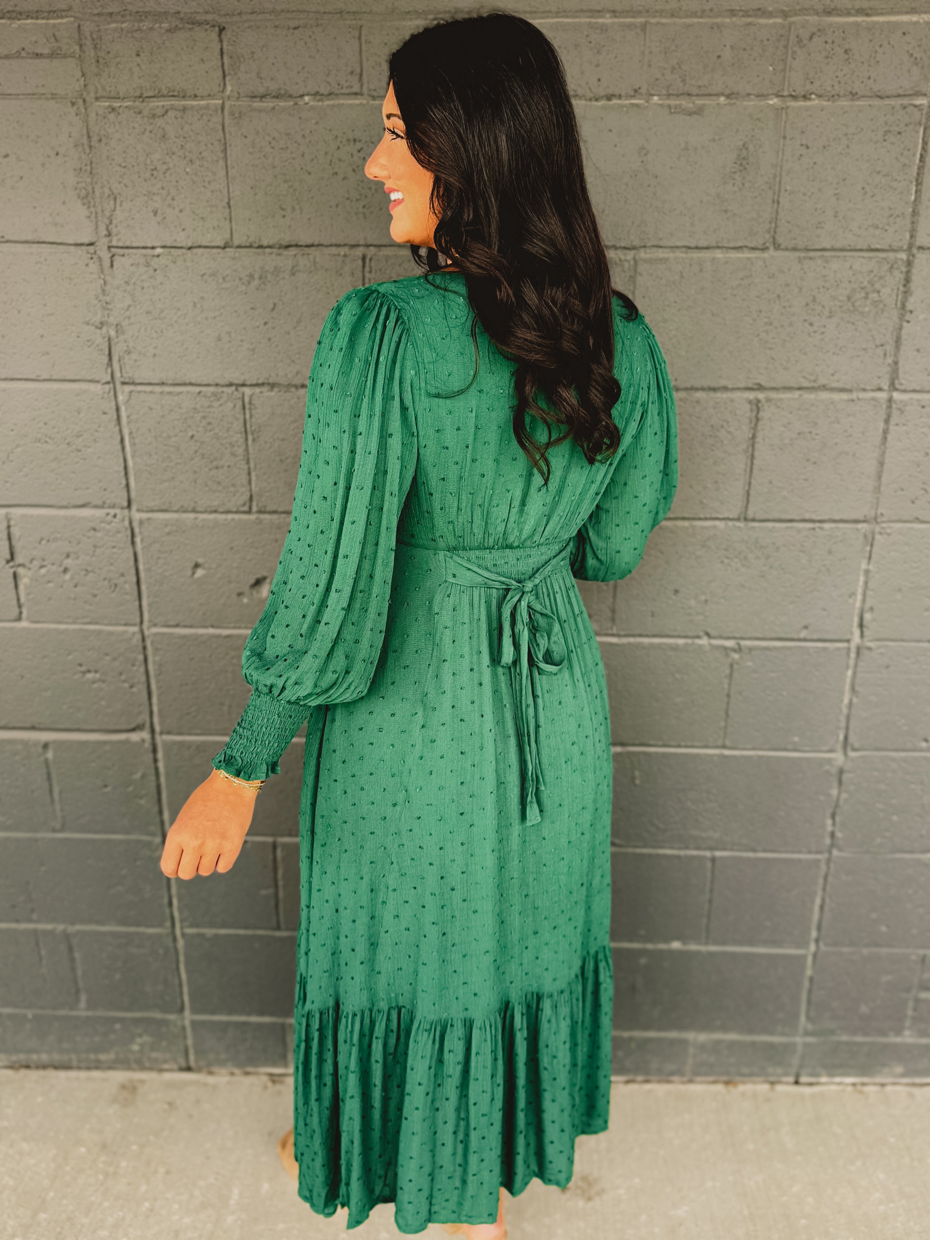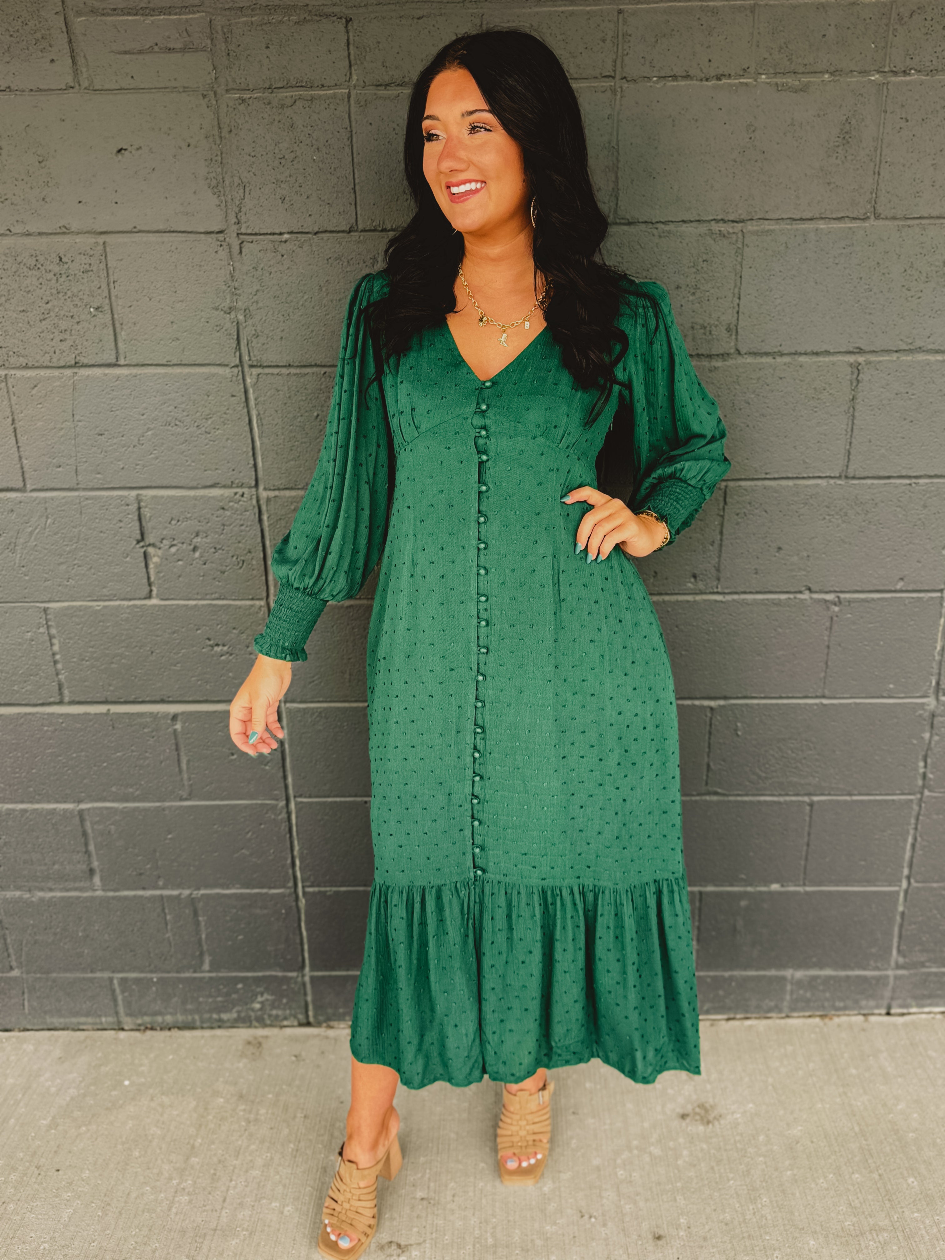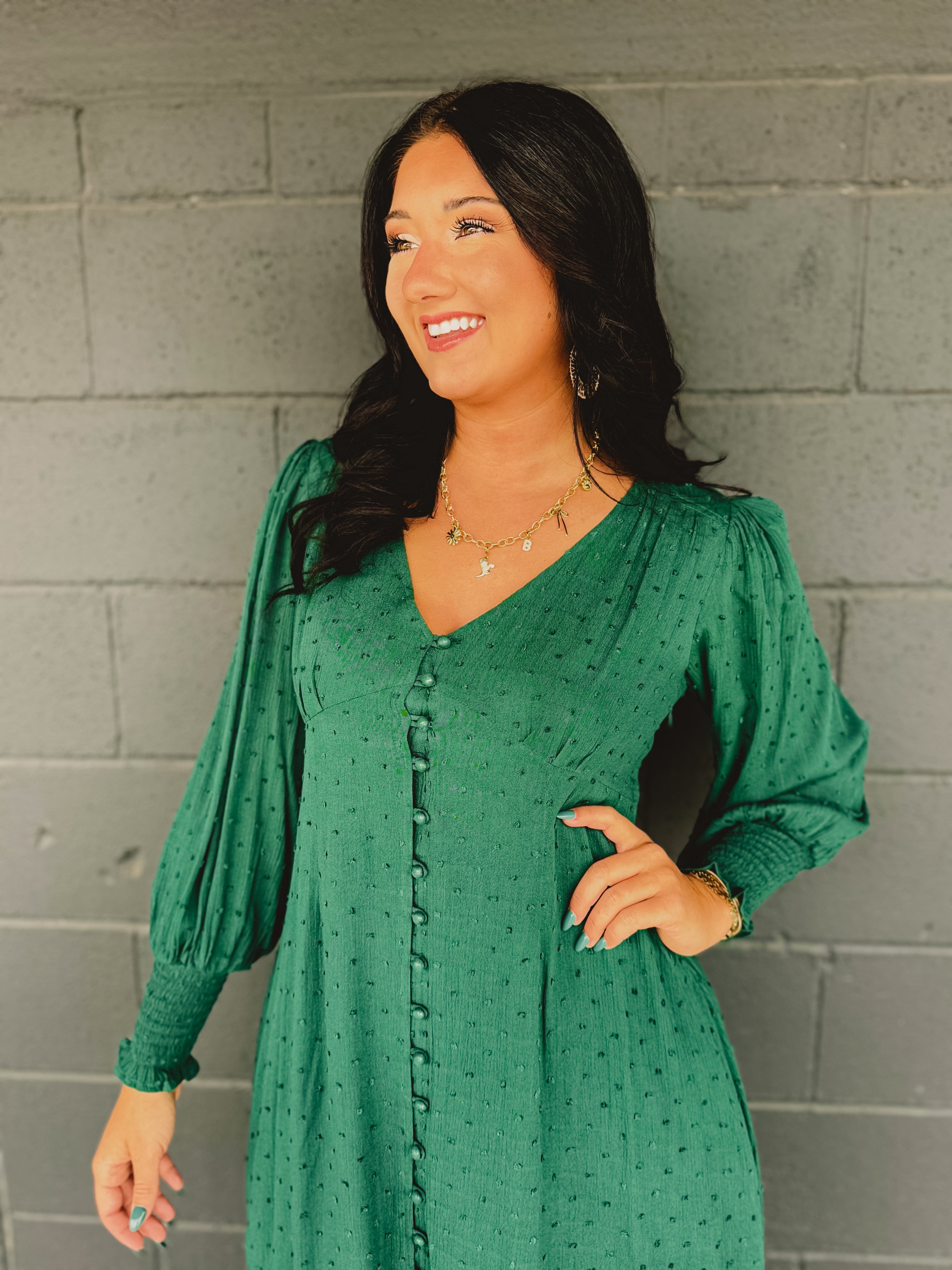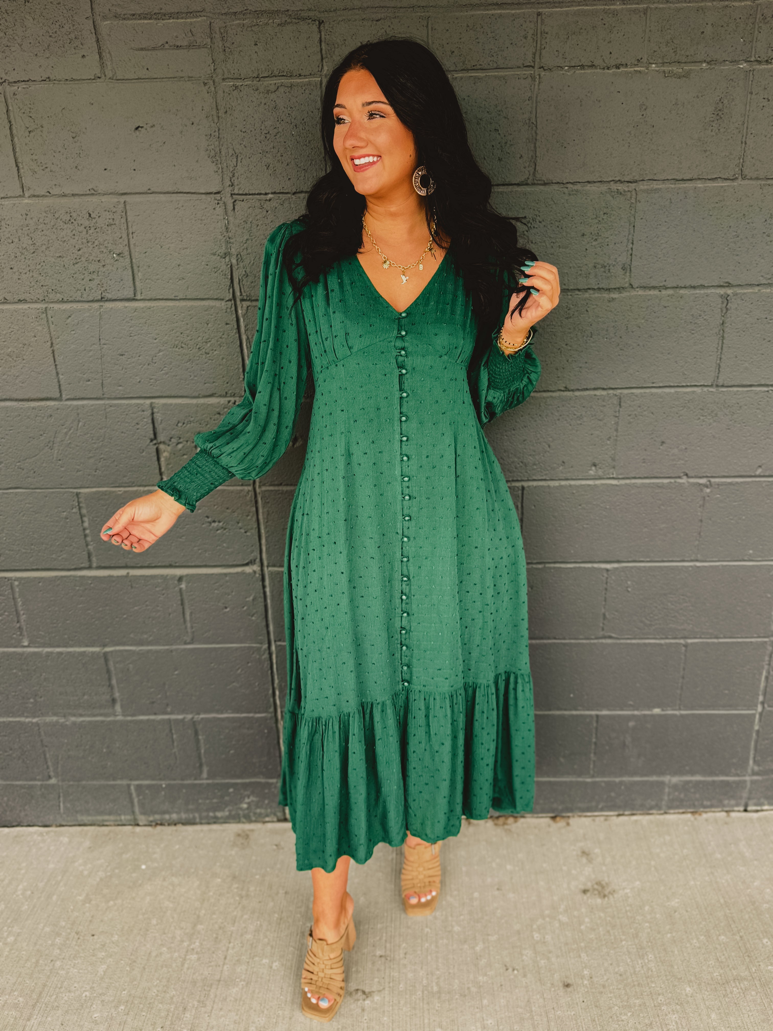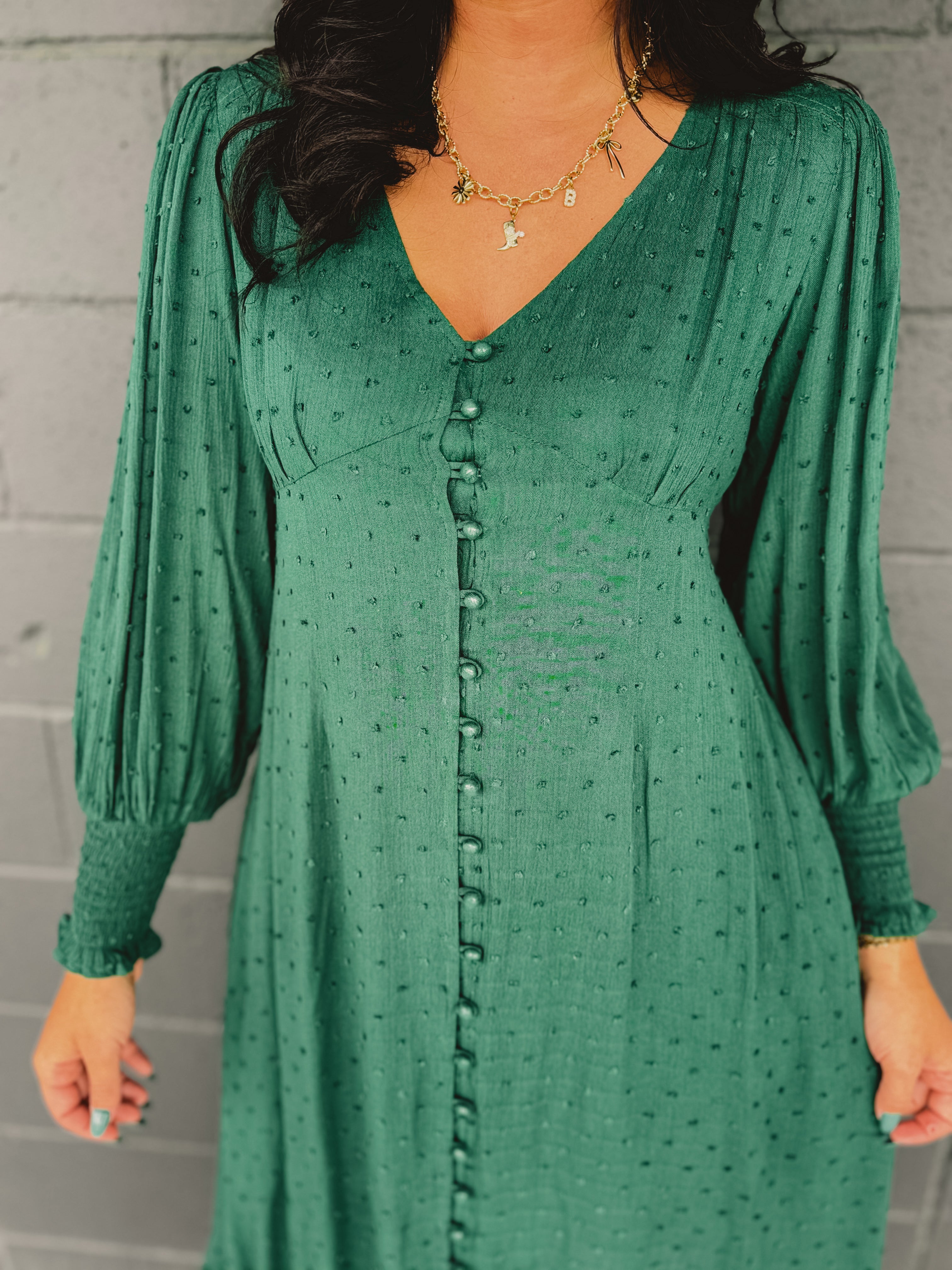 Swiss Dot Long Sleeve Button Maxi Dress - Evergreen