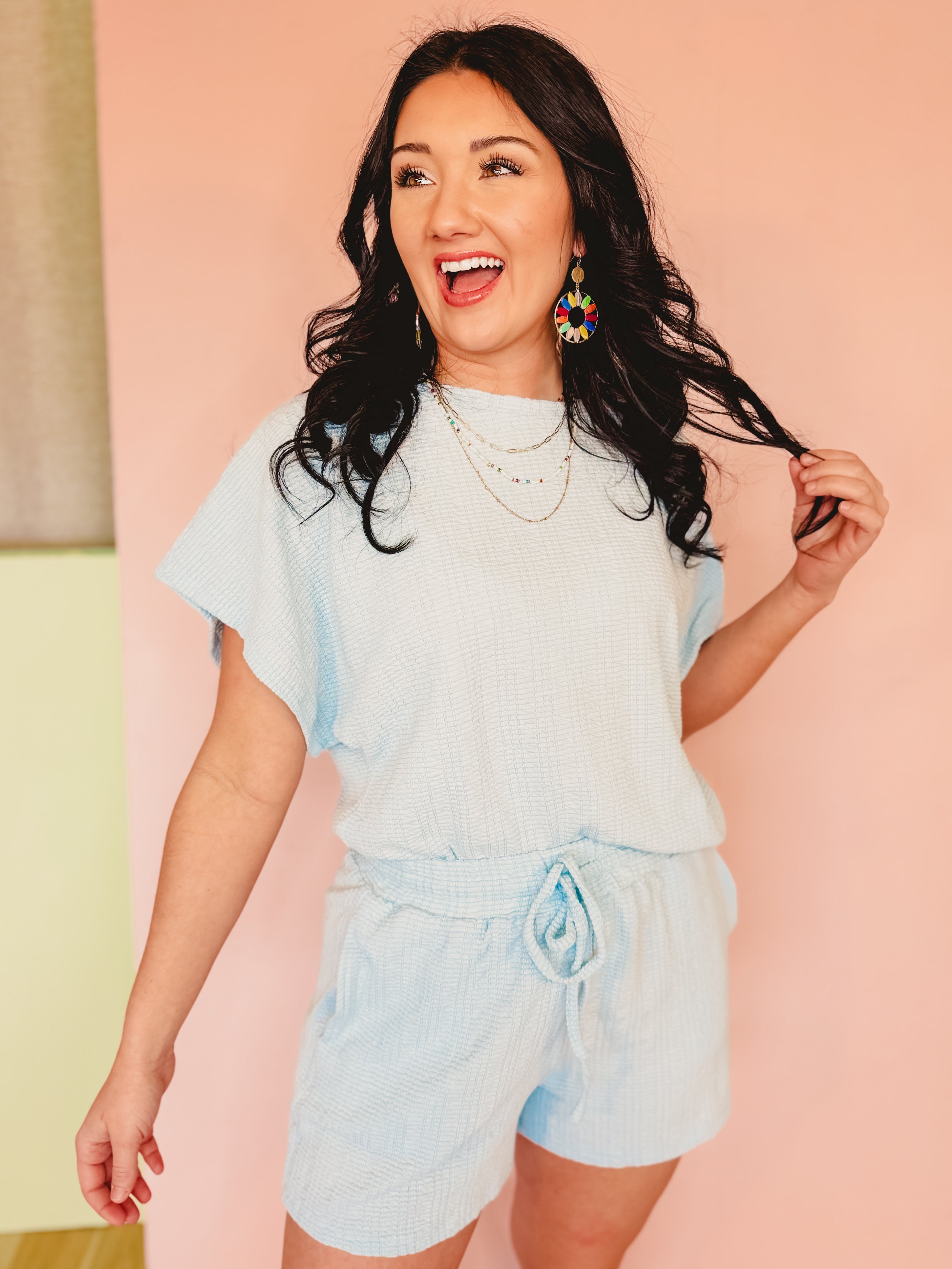Stay cozy and stylish with this textured knit top and shorts set. Designed for relaxed comfort, it’s perfect for lounging or casual outings.