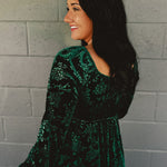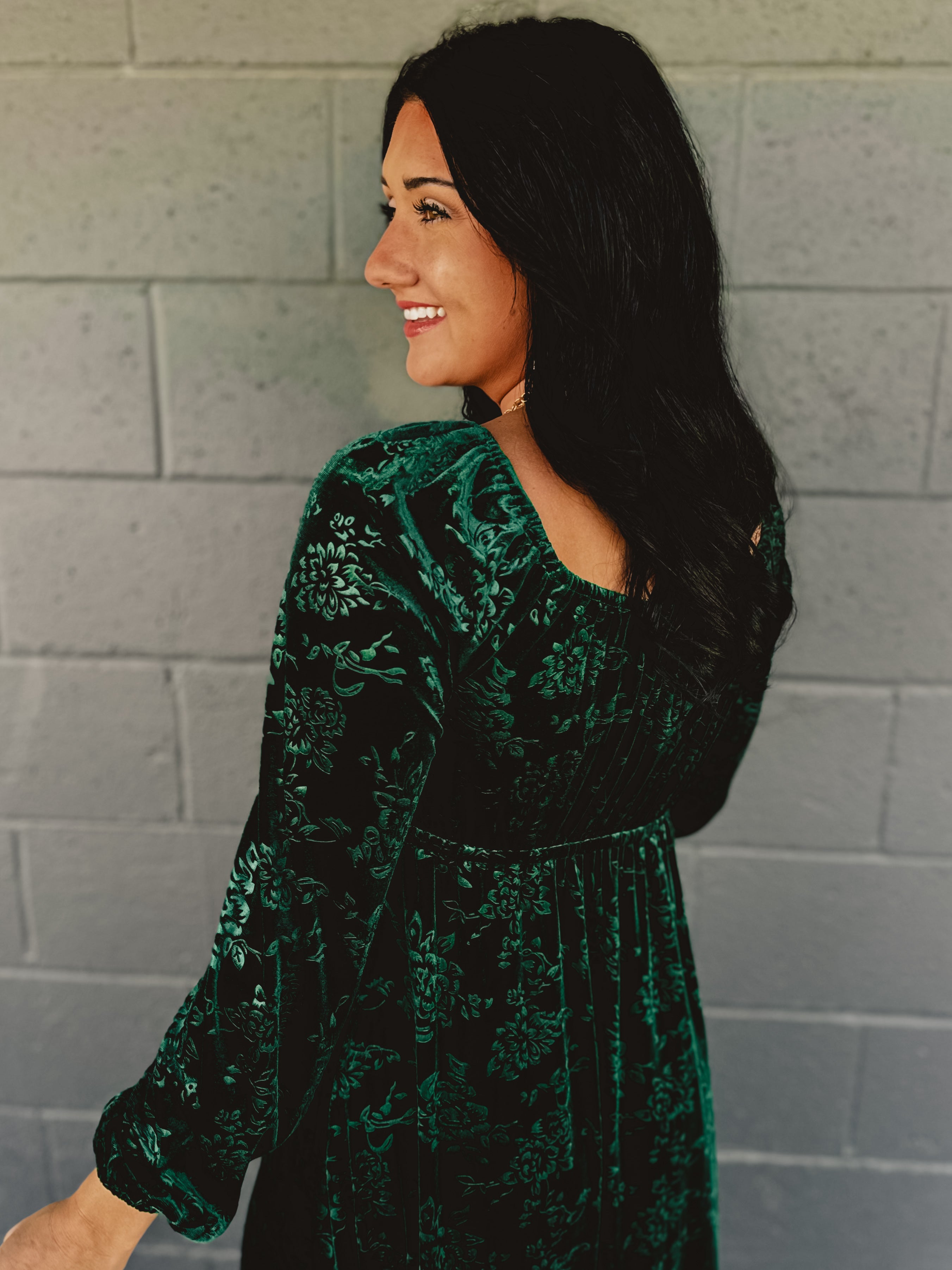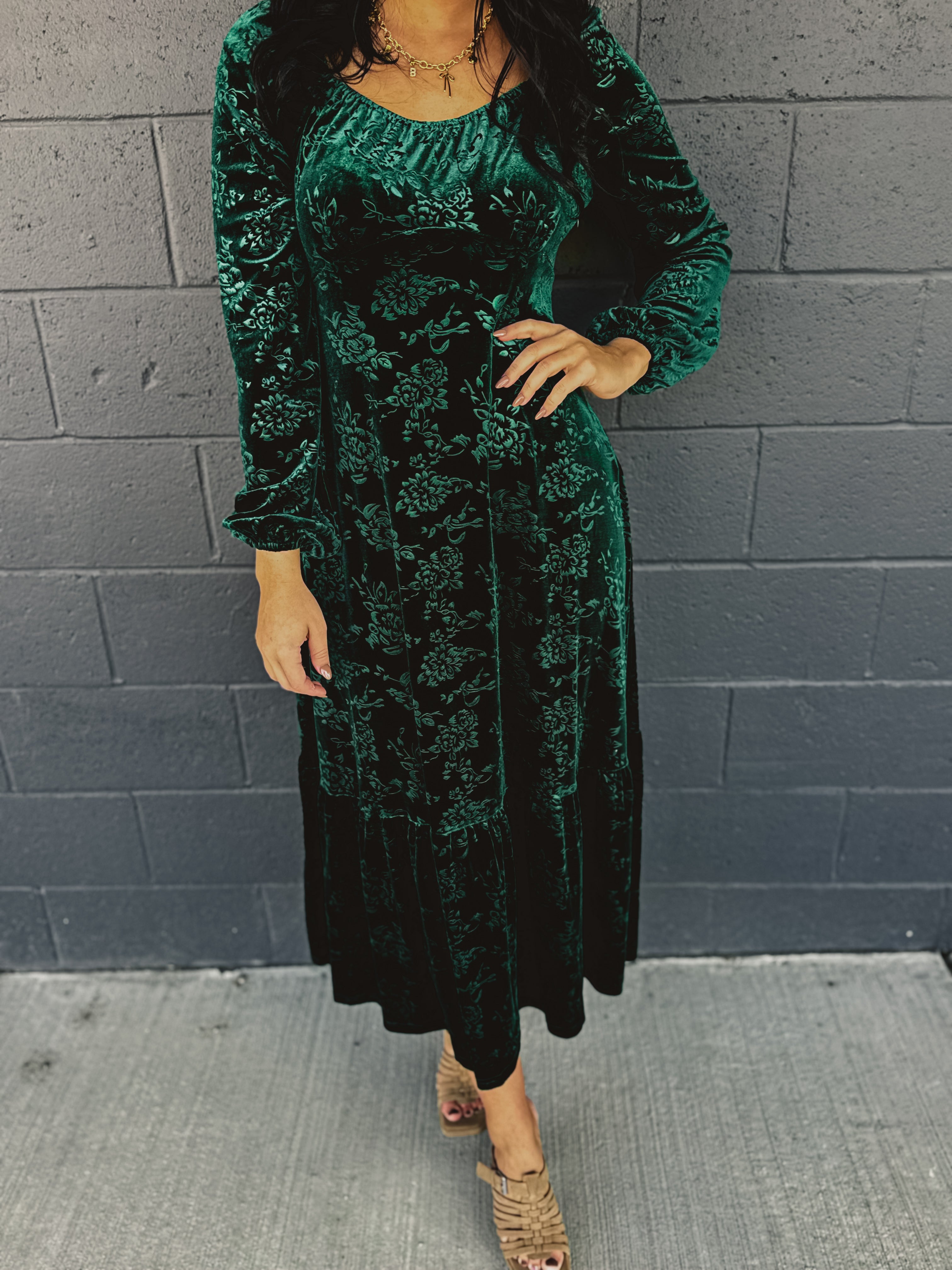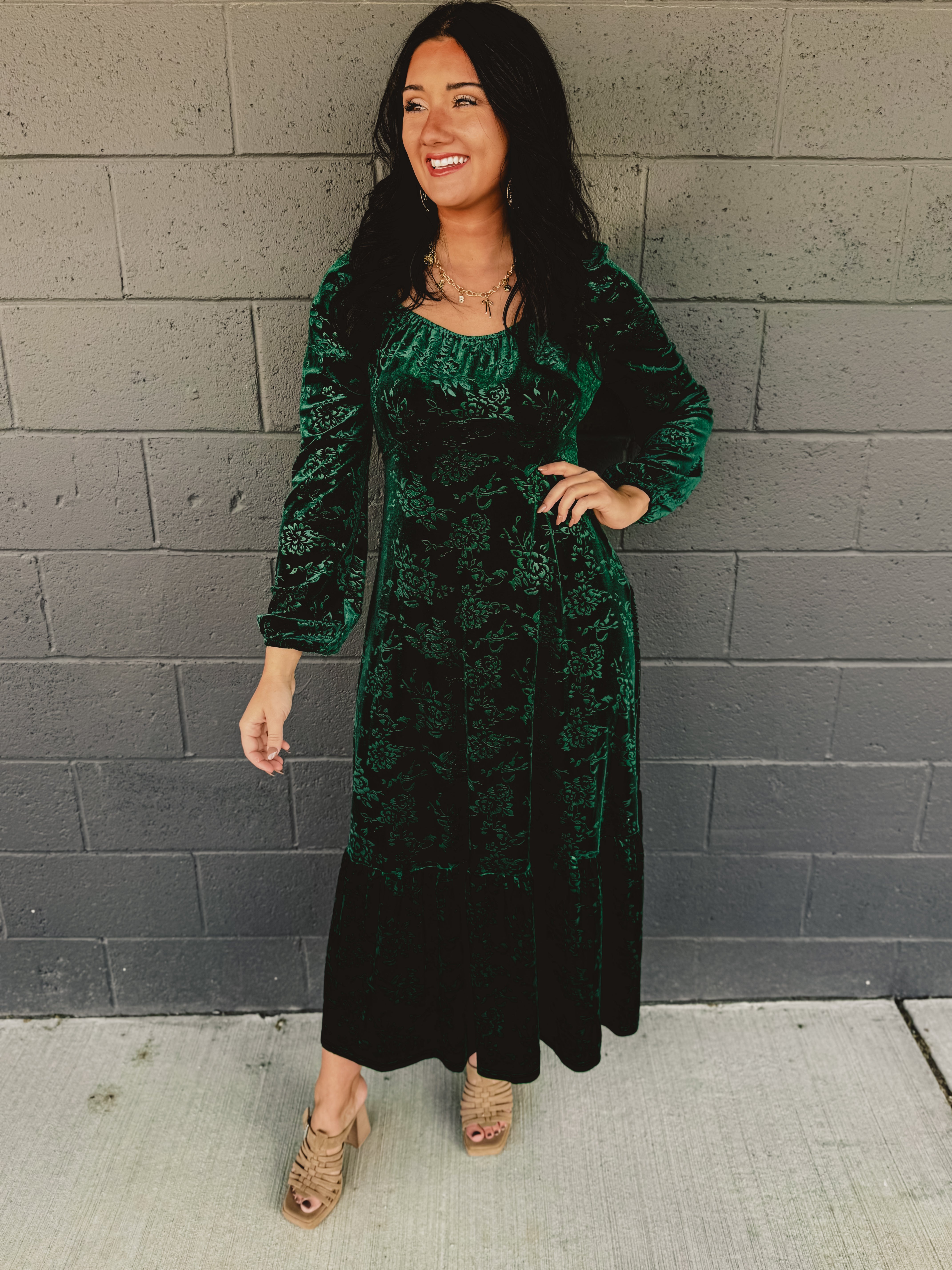 Velvet Embossed Long Sleeve Maxi Dress - Emerald