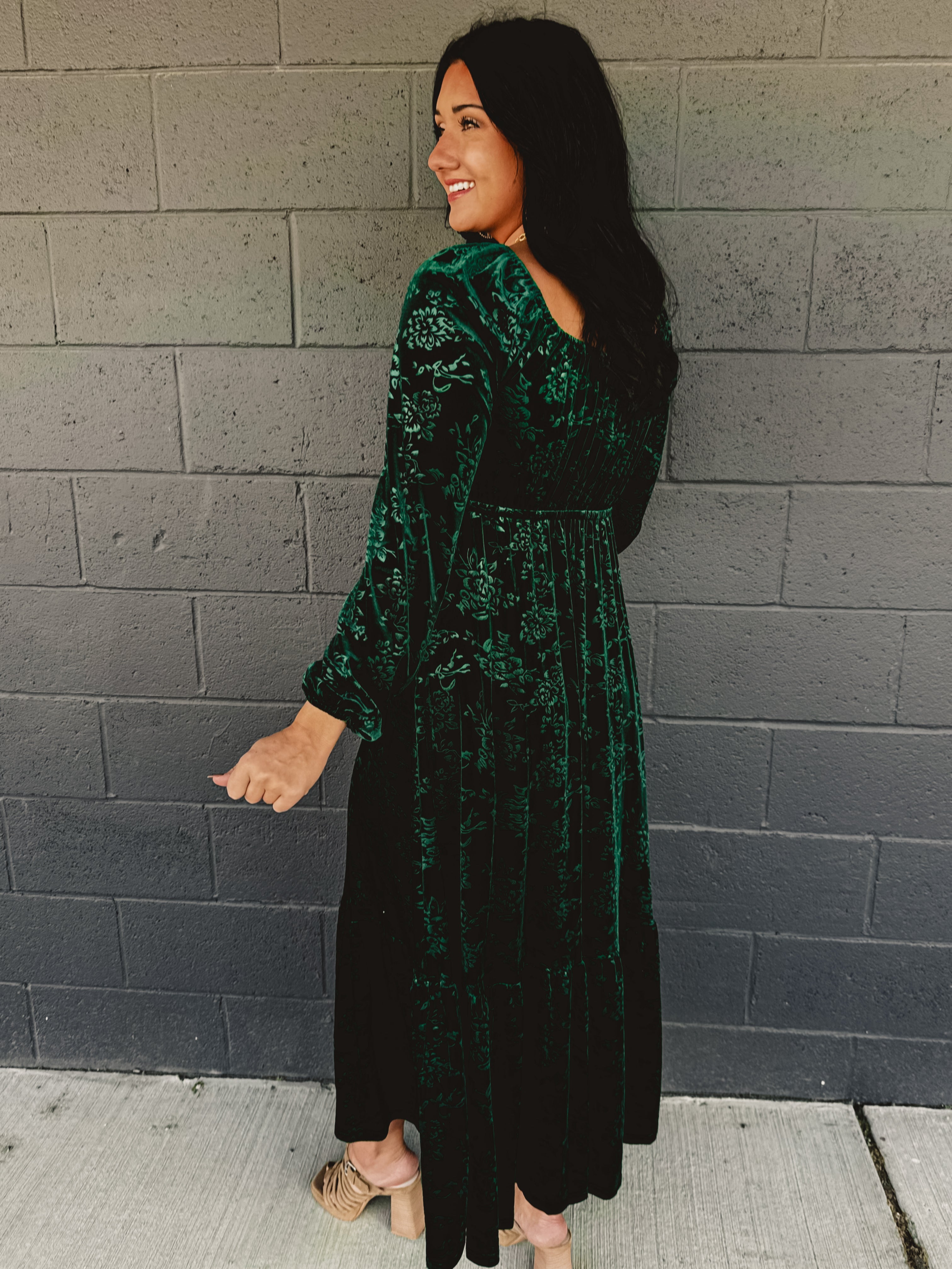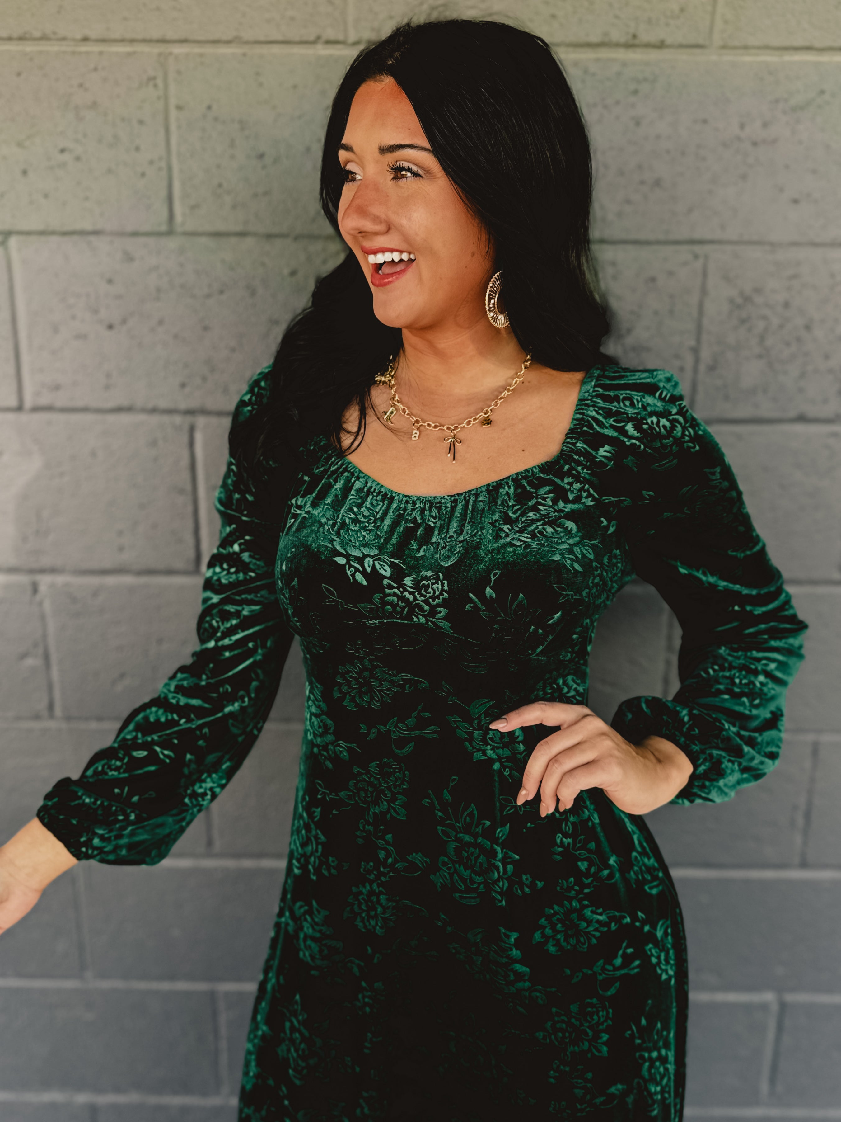 Rich and elegant, this malachite velvet maxi dress showcases an embossed design with long sleeves, creating a timeless silhouette made for special occasions!