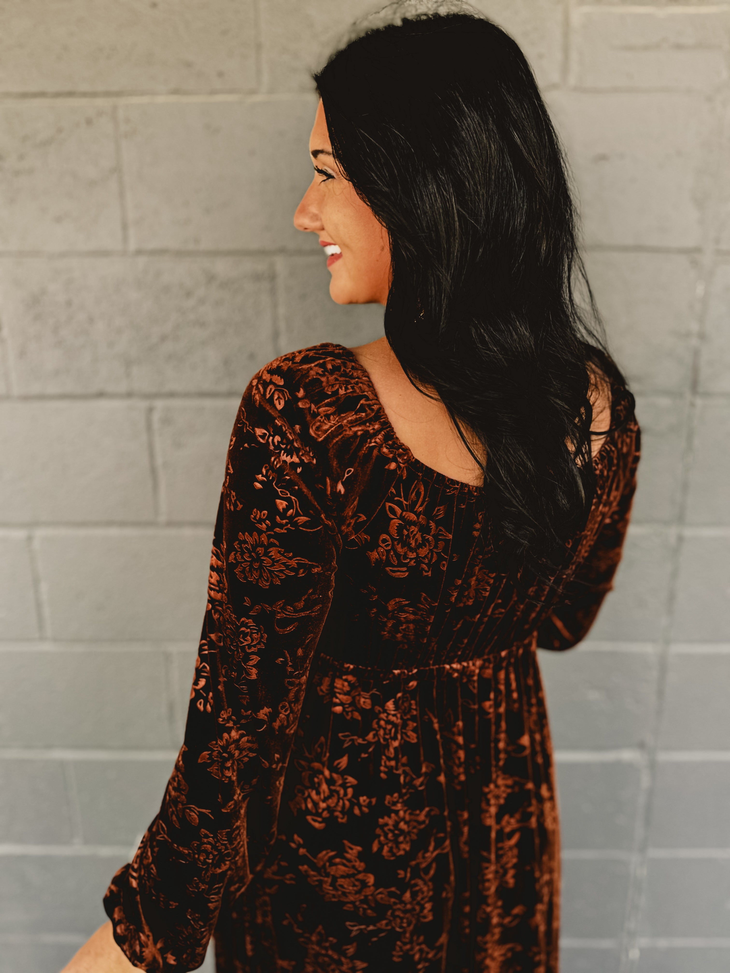 Luxurious and romantic, this mocha velvet maxi dress features an embossed design and long sleeves for an elegant silhouette that’s perfect for special occasions!