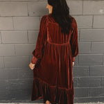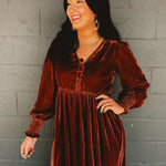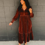 This camel velvet long sleeve maxi dress brings a cozy yet elegant fall vibe, perfect for seasonal gatherings or autumn evenings out!