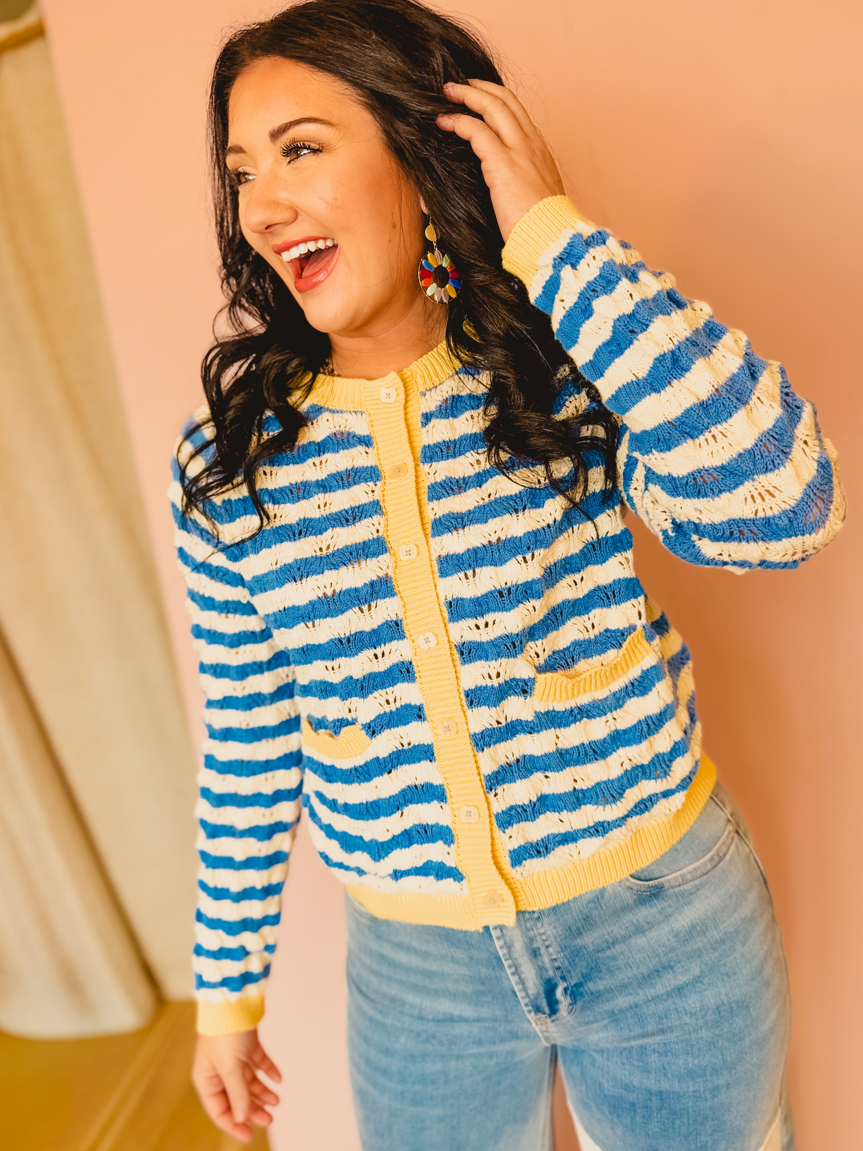 This knit cardigan features textured wavy stripes and bold contrast for a playful, seaside-inspired look. Designed to be easy and comfy, it’s perfect for layering through spring and summer.
