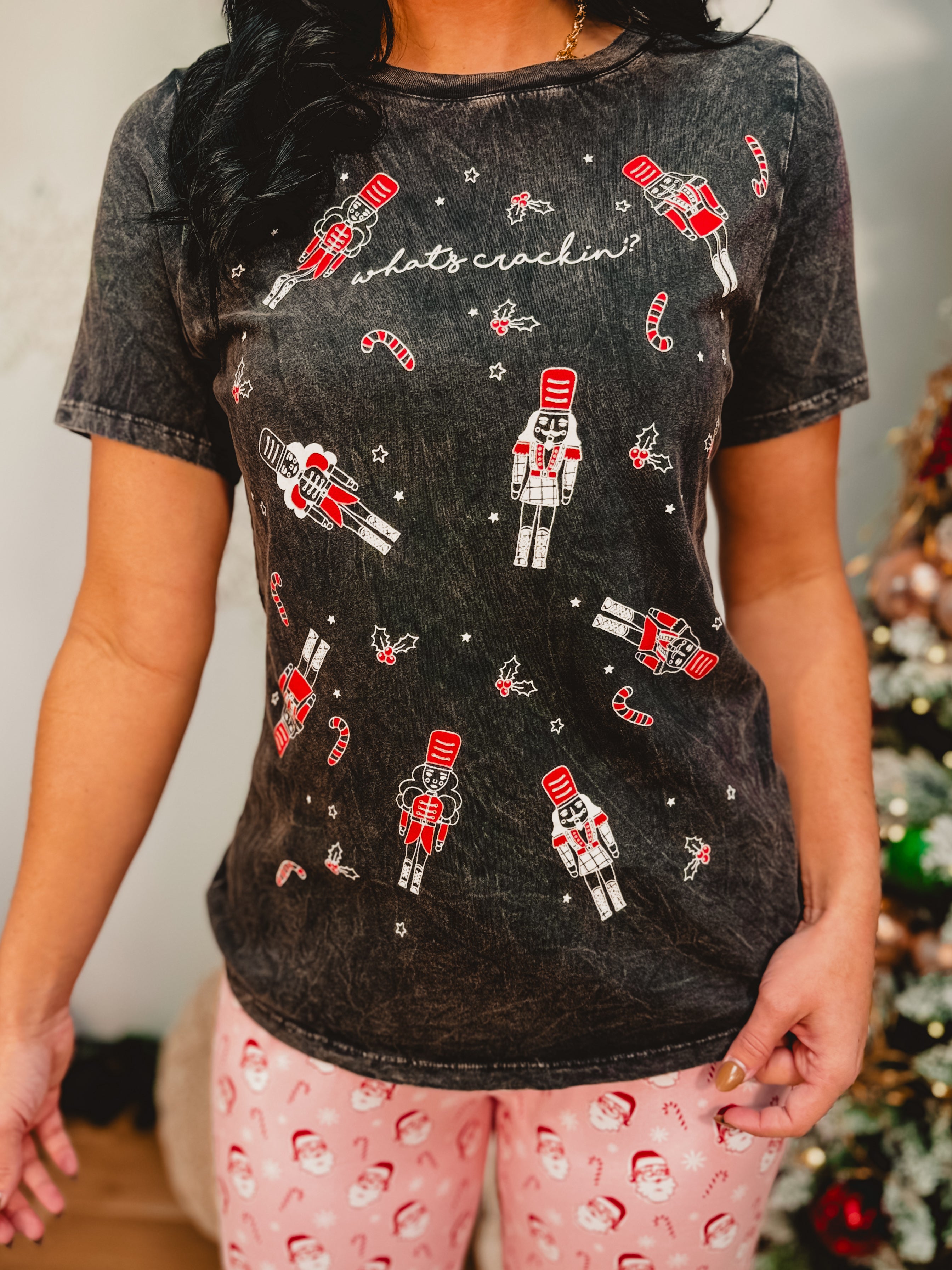 Bold and playful, this black mineral-washed tee features a whimsical “What’s Crackin’” Nutcracker graphic, serving festive attitude with a vintage-casual feel perfect for holiday season style.